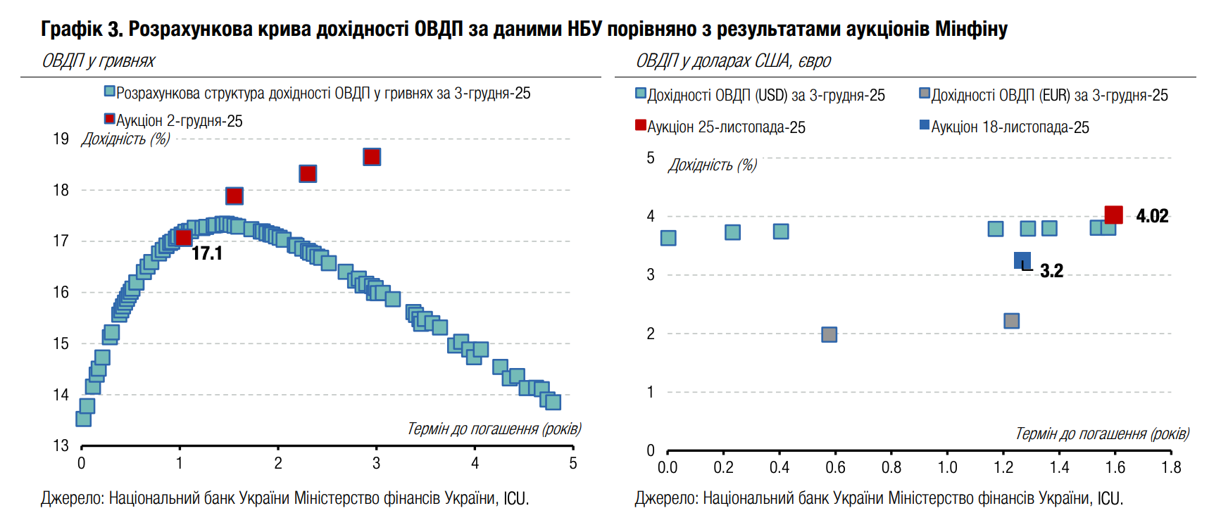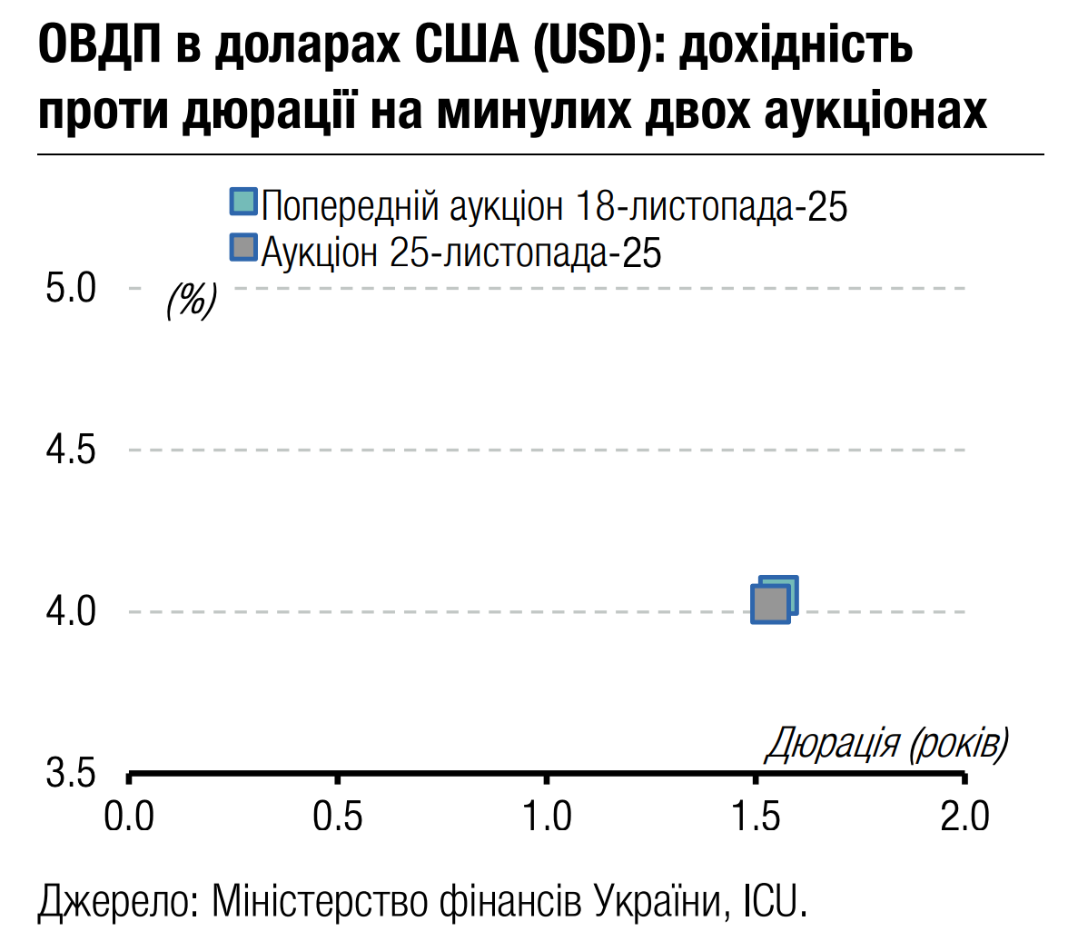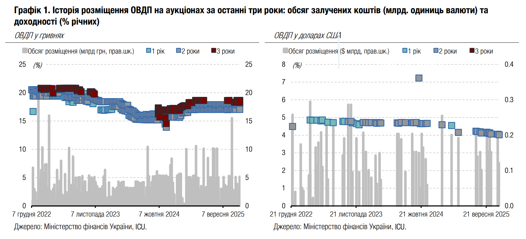 Примітка: [1] по валютних ОВДП обсяг залучених коштів та номінальний обсяг облігацій, що були випущені, наводиться у гривневому еквіваленті за ринковим курсом 42.27/USD, 48.57/EUR;[2] по облігаціях із строком обігу 1 рік і більше наводиться ефективна дохідність до погашення; скорочення в графі "Виплата": К - квартальна виплата купону, ПР - виплата купону кожні півроку, Д - дисконтна облігація з нульовою ставкою купона. Джерела: Міністерство фінансів України, Bloomberg, ICU.