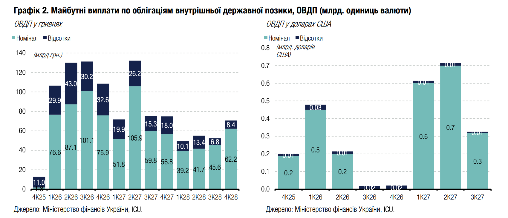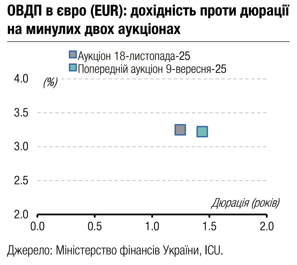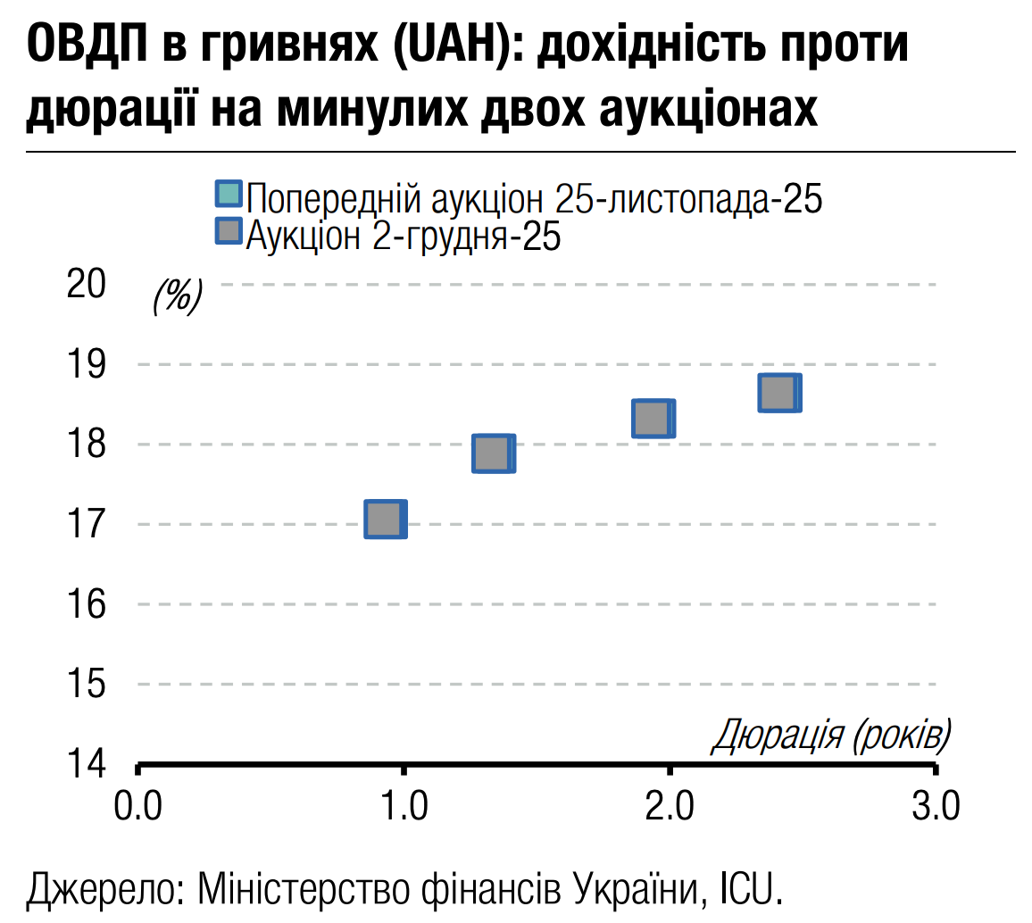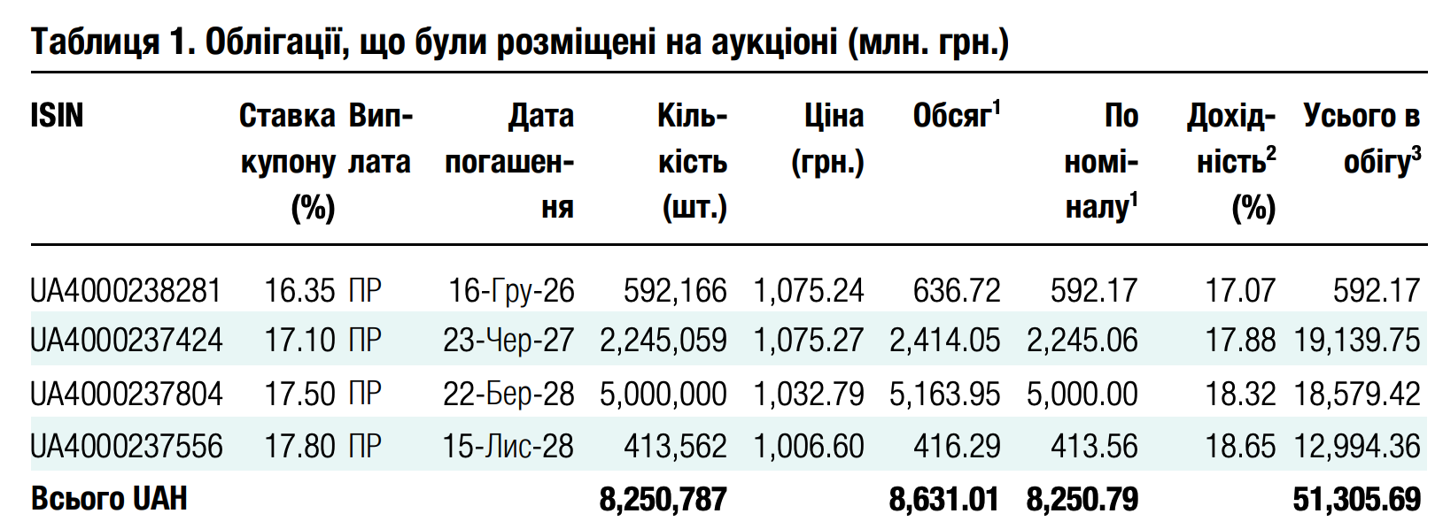 Примітка: [1] по валютних ОВДП обсяг залучених коштів та номінальний обсяг облігацій, що були випущені, наводиться у гривневому еквіваленті за ринковим курсом 42.27/USD, 48.57/EUR;[2] по облігаціях із строком обігу 1 рік і більше наводиться ефективна дохідність до погашення; скорочення в графі "Виплата": К - квартальна виплата купону, ПР - виплата купону кожні півроку, Д - дисконтна облігація з нульовою ставкою купона. Джерела: Міністерство фінансів України, Bloomberg, ICU.