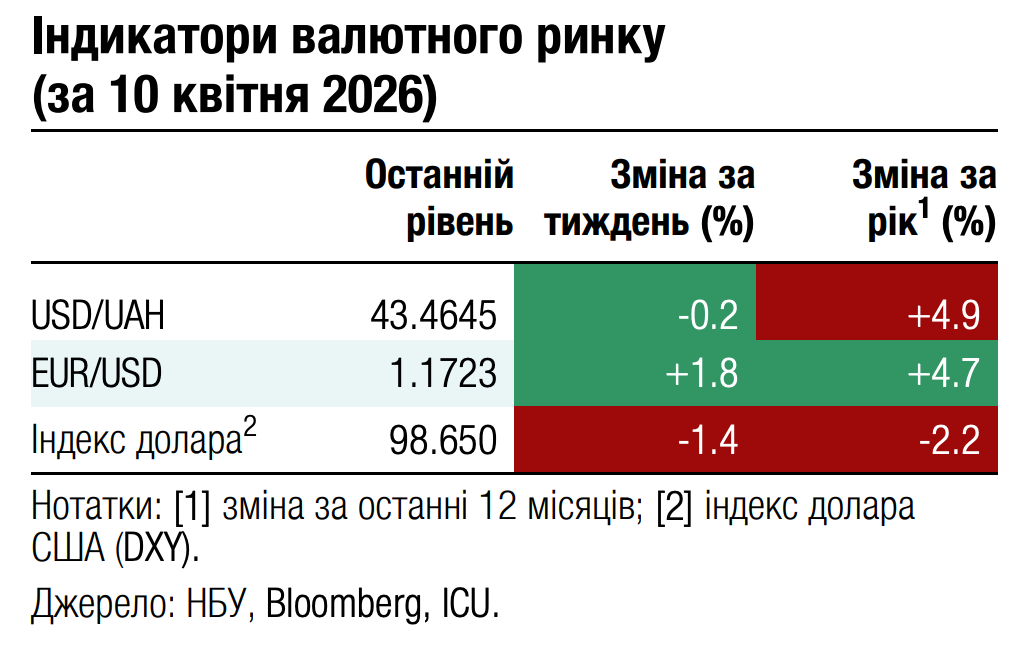 Наприкінці тижня ралі стало гальмувати на тлі все більших свідчень порушення перемир’я Іраном, а також продовження Ізраїлем активних бойових дій у Лівані. Також залишався вкрай обмеженим рух танкерів через Ормузьку протоку. Утім ринки продовжували покладати надії на подальшу деескалацію і, зокрема, на позитивні результати переговорів представників США та Ірану в Пакистані на вихідних. Тижневе зростання американських індексів акцій стало найбільшим із листопада минулого року. Індекс S&P 500 додав у вартості 3.6%, Nasdaq 100 зріс на 4.5%. Водночас вартість енергетичного сектору S&P 500 знизилась на 4.1%. Ціни на нафту марки Brent впали за тиждень на 13% до $95 за барель, а європейські індикативні котирування природного газу TTF – на 11% до $540 за тис. куб. м.