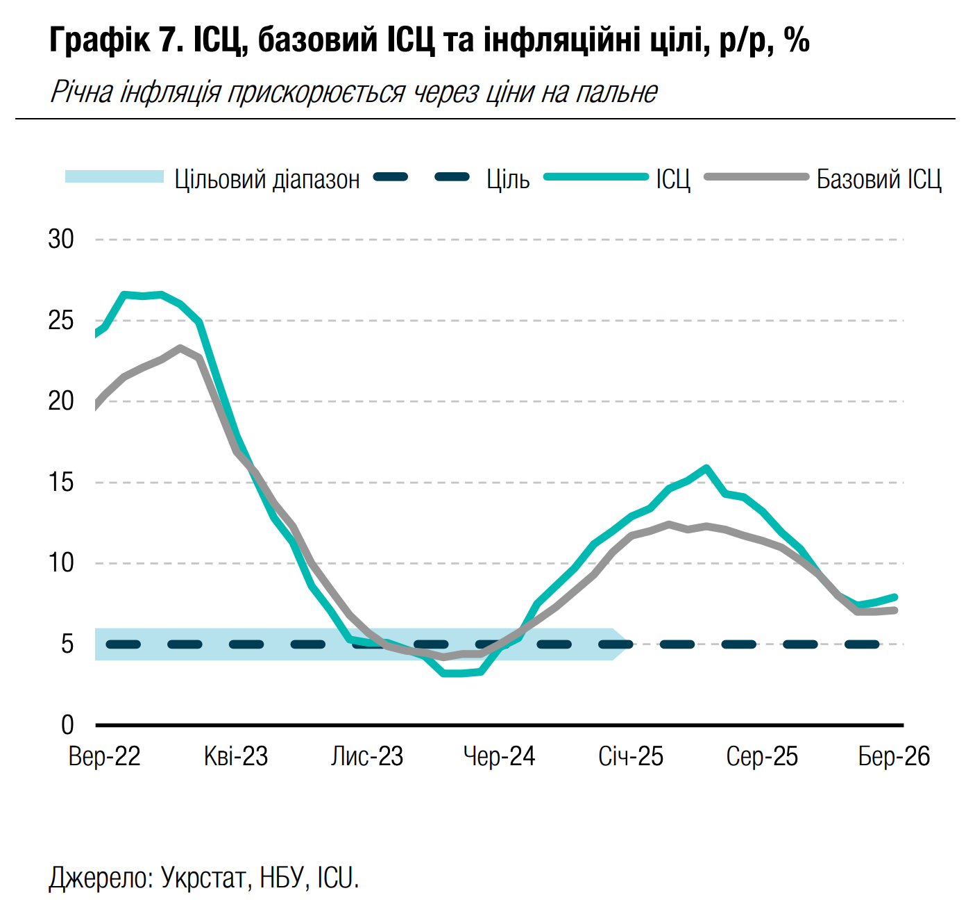 Різке зростання цін на пальне та тарифів на пасажирські транспортні перевезення були ключовим чинником місячної інфляції в березні: їхній внесок склав близько 0.6 в.п. до загального місячного показника 1.7%. Тарифи на зв'язок також помітно зросли минулого місяця (+2.4% м/м та +14.9% р/р), адже мобільні оператори продовжили перекладати на клієнтів вищі витрати на забезпечення безперебійної роботи в умовах обмежень на споживання електроенергії. Важливо, що річні темпи зростання цін на багато значних за розміром груп товарів продовжували знижуватися, зокрема на продукти харчування (+9.3% у березні проти +9.7% у лютому), комунальні послуги (+1.7% проти +2.3%) та послуги охорони здоров’я (+2.0% проти +3.2%).