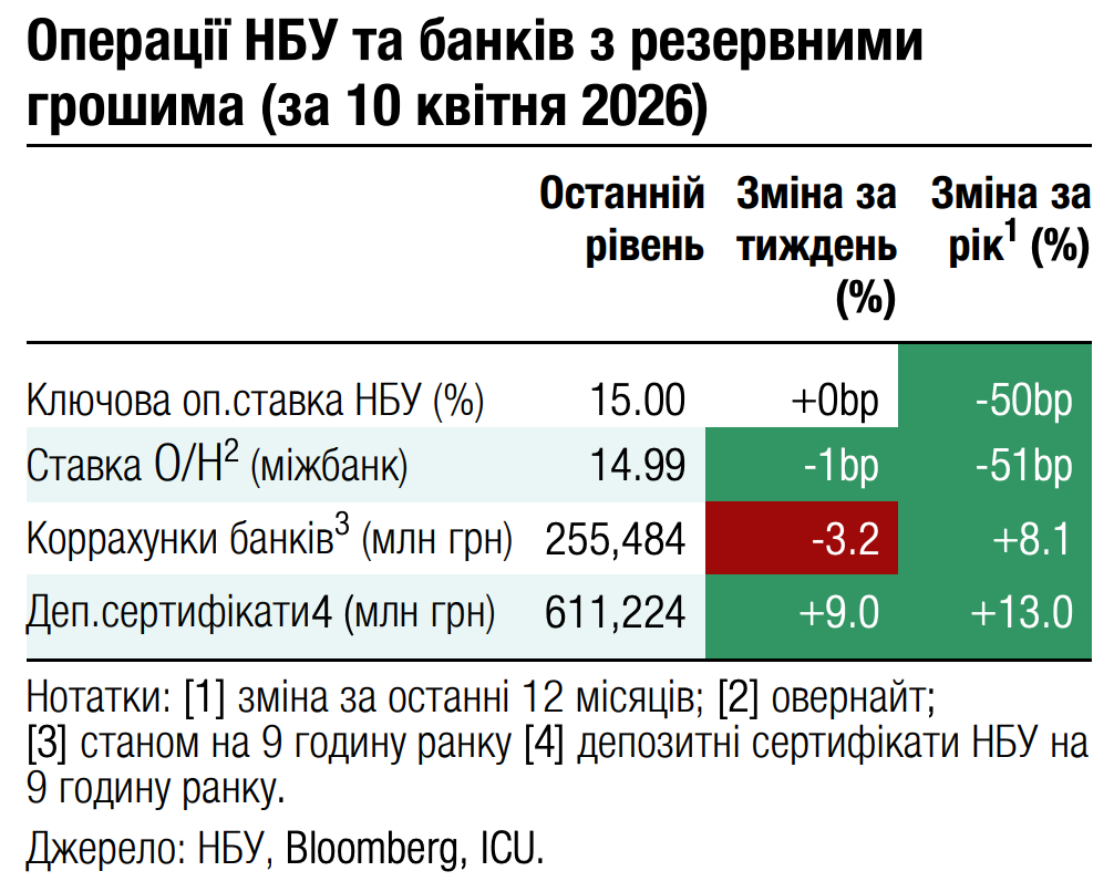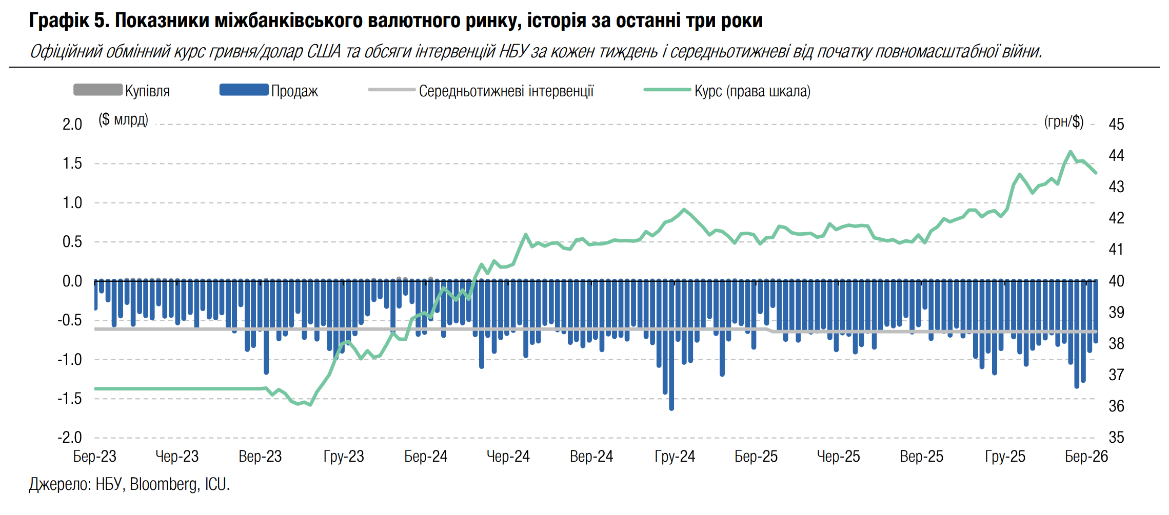 Погляд ICU: Інтервенції НБУ залишаються підвищеними, адже світова енергетична криза посилює дисбаланси зовнішніх рахунків України. Від початку року НБУ витратив $12.6 млрд на інтервенції з продажу валюти – це на 27% більше, ніж за аналогічний період попереднього року. Водночас припливи зовнішньої фінансової допомоги склали всього $6.8 млрд у 1кв26 – це лише невеличка частка від $51.4 млрд, яку цьогоріч мала би отримати Україна відповідно до оцінок МВФ. Ми очікуємо, що фінансову допомогу від ЄС буде розблоковано після парламентських виборів в Угорщині і нові кредити дадуть НБУ можливість підтримувати рівень резервів понад $50 млрд протягом року. Тож ми й далі переконані, що НБУ матиме достатньо ресурсів, щоб повністю контролювати валютний ринок, однак із урахуванням величезних зовнішніх дисбалансів змушений буде поступово послаблювати гривню надалі.