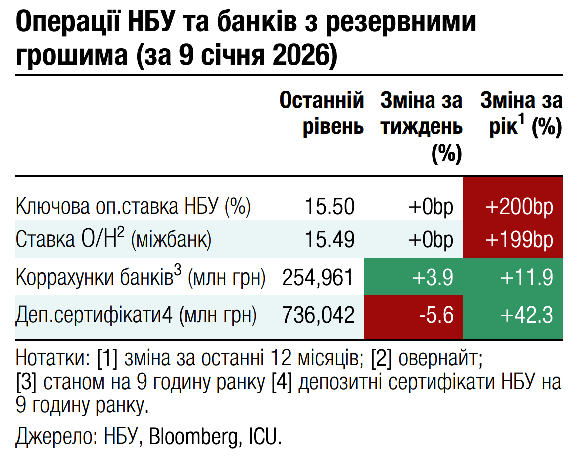 За перші дев'ять днів нового року Національний банк ослабив офіційний курс гривні на 1.7% до 43.08 грн/$. Відбувалося це за досить невеликих інтервенцій: у новорічний тиждень інтервенції склали $633 млн, а минулого тижня дещо зросли до $712 млн. Для порівняння: в аналогічний період минулого року НБУ витратив на інтервенції майже $1.8 млрд. Дефіцит валюти в перші вісім днів 2026 року склав $639 млн, тоді як в аналогічний період 2025 року дефіцит перевищував $1 млрд.