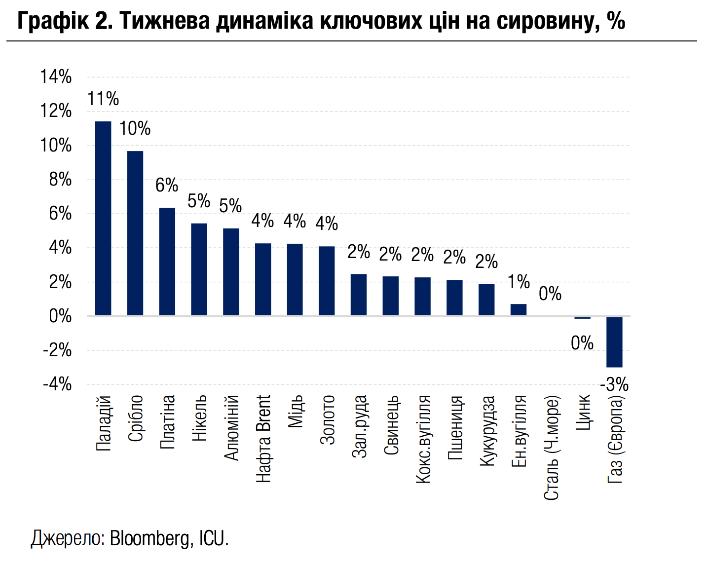 Геополітичне загострення надало новий поштовх цінам на золото (+4% за тиждень), срібло (+10%) та інші дорогоцінні метали. Заявлені Дональдом Трампом плани продавати підсанкційну венесуельську нафту через американські компанії спричинили зниження цін на нафту на початку тижня. Утім заворушення в Ірані посилили страхи збоїв у експорті нафти з цієї країни, і за підсумками тижня ціни на нафту зросли на 4%.