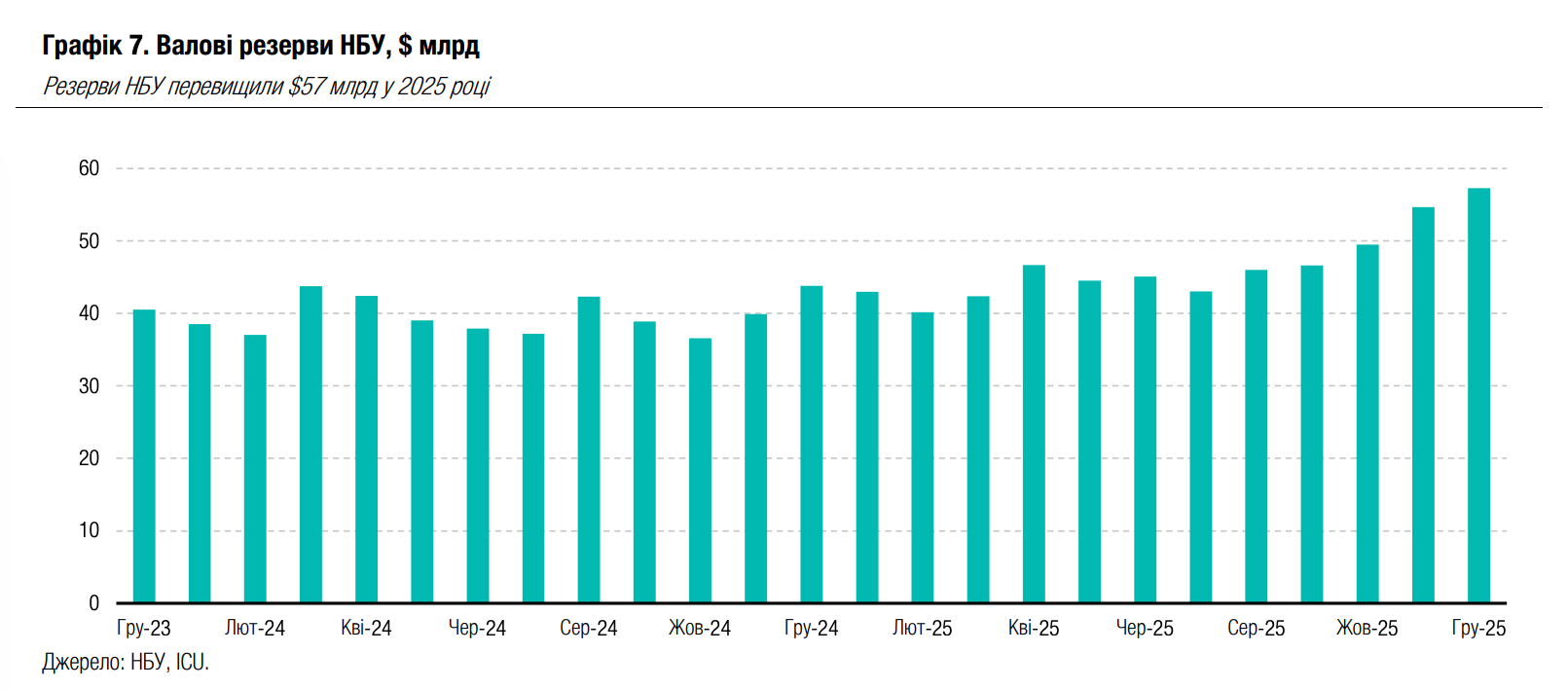Валові резерви НБУ в грудні зросли на 4.6%, а протягом 2025 року на 31% до рекордного рівня $57.3 млрд., що, за оцінками НБУ, еквівалентно 5.9 місяцям майбутнього імпорту.