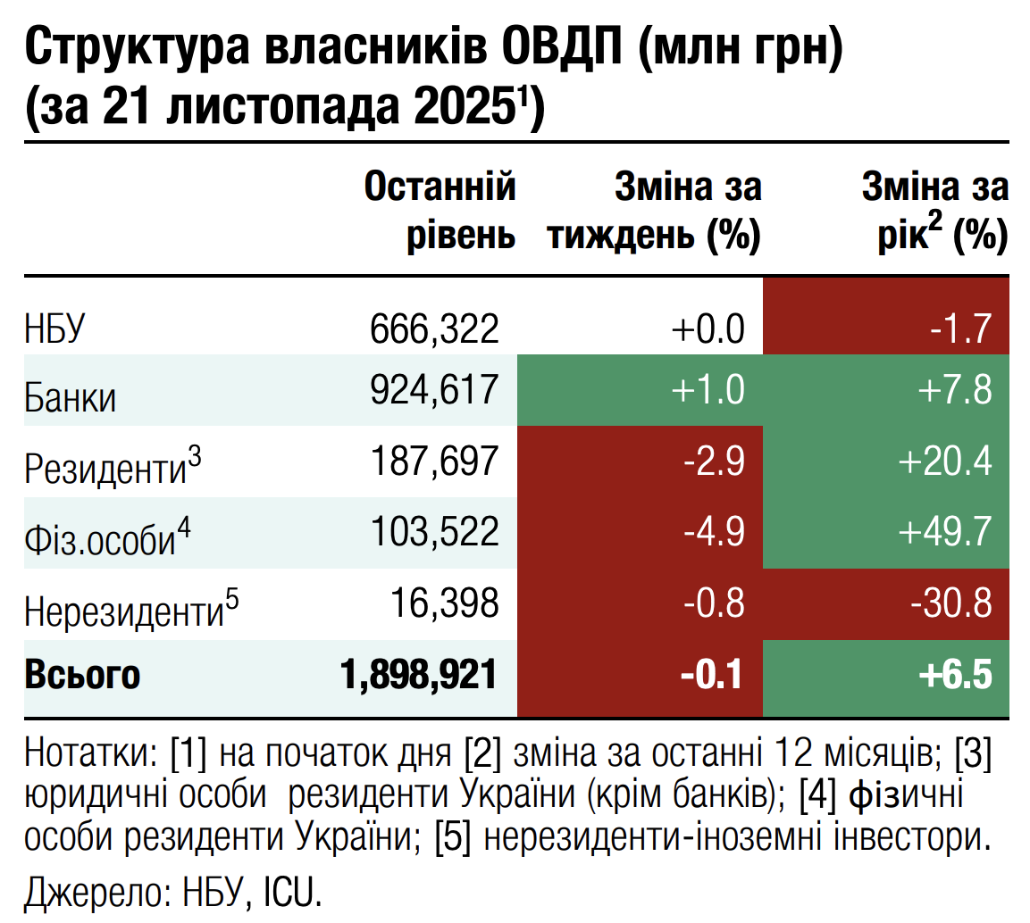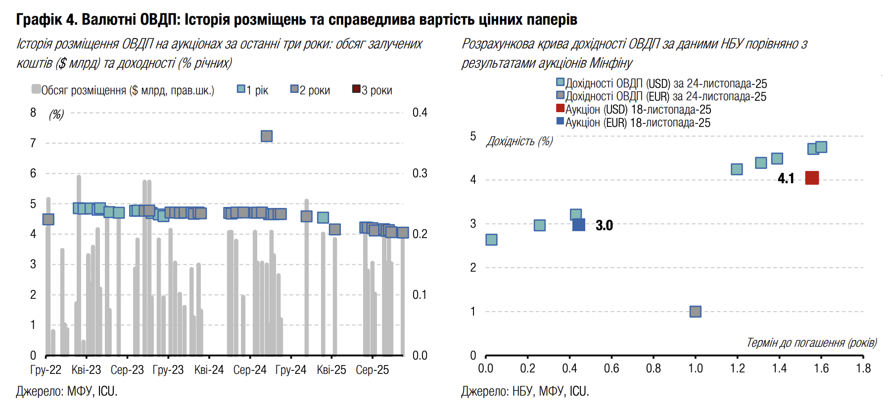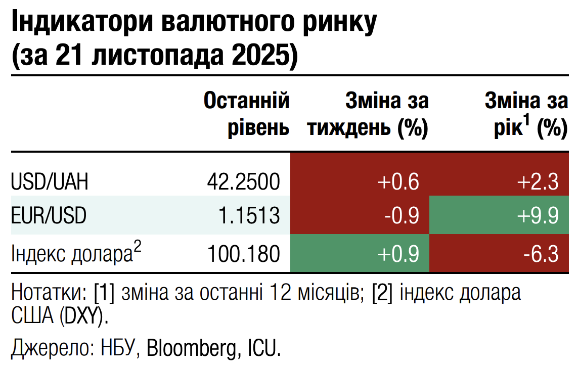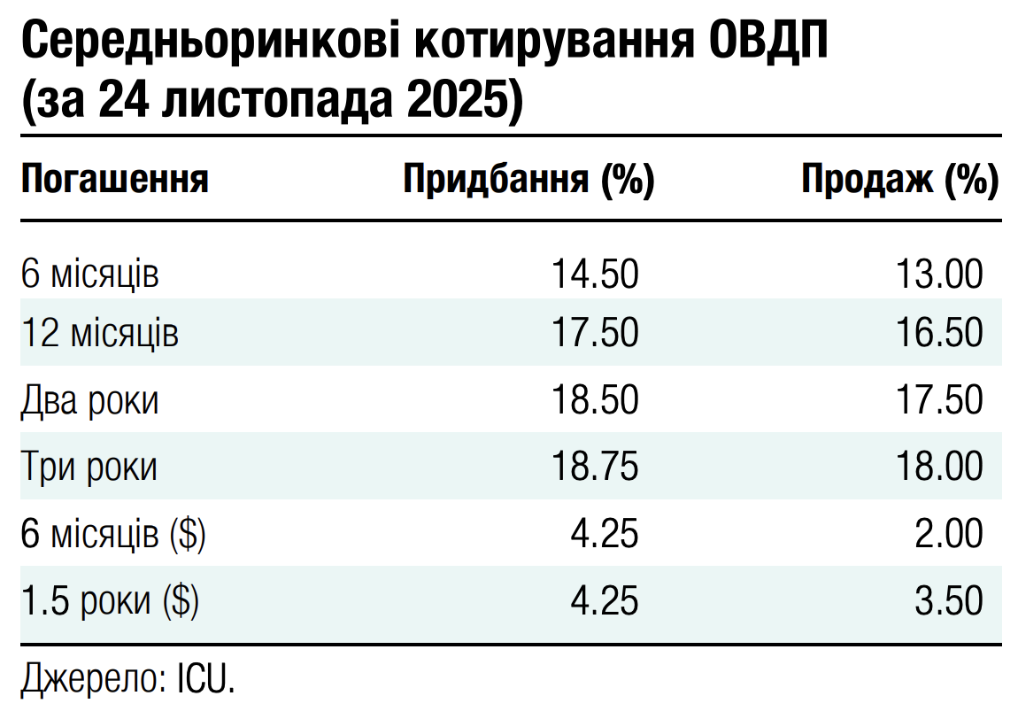 Минулого тижня Міністерство фінансів погасило валютні ОВДП у доларах США на майже $362 млн і розмістило нових облігацій на $200 млн (див. огляд аукціону). На завтра міністерство анонсувало розміщення ще $200 млн валютних ОВДП з погашенням у липні 2027 року. Більше валютних погашень у листопаді не заплановано, а на початку грудня відбудеться останнє цього року погашення валютних ОВДП на $188 млн.