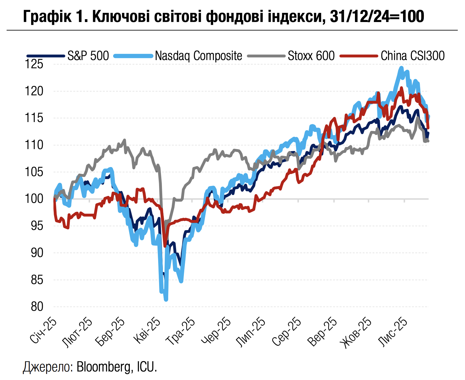 Найзначнішою подією для ринків акцій минулого тижня стало оприлюднення фінансового звіту за 3кв25 компанії Nvidia, провідного американського виробника мікросхем, які використовуються у технології ШІ. Напередодні оприлюднення розпродажі акцій Nvidia та інших компаній IT-сектору посилилися через побоювання, що фінансові результати компанії виявляться гіршими за очікування. Проте як доходи від продажів, так і чистий прибуток Nvidia значно перевершили прогнози. Також кращими за очікування виявилися прогнози компанії на решту 2025 і на 2026 р. Утім позитивна реакція ринків на звіт виявилася швидкоплинною, і вже наступного дня падіння котирувань сектору відновилося. Додатково погіршили настрої слабкі фінансові результати провідних американських ритейлерів Target і Home Depot. Водночас сильного звіту від найбільшої роздрібної мережі США Walmart виявилося недостатньо, щоб поліпшити настрої.
