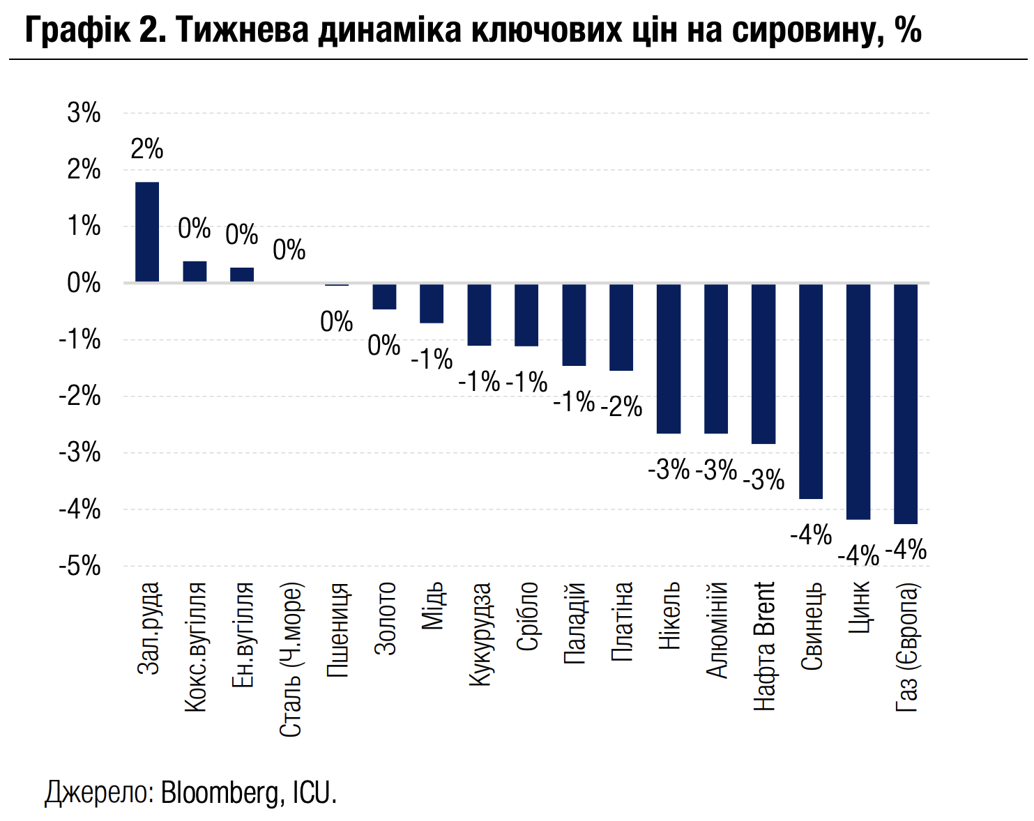 На сировинних ринках настрої також були переважно негативними. Одним із небагатьох матеріалів, що додали минулого тижня в ціні, була залізна руда (+2%) – через посилення надій на нові заходи державного стимулювання секторів будівництва й нерухомості в Китаї. Водночас нафта (-3%) і природний газ (-4%) опинилися серед аутсайдерів тижня – через очікування більш ніж достатньої пропозиції на відповідних ринках, а також через активізацію зусиль США для зупинення російсько-української війни.