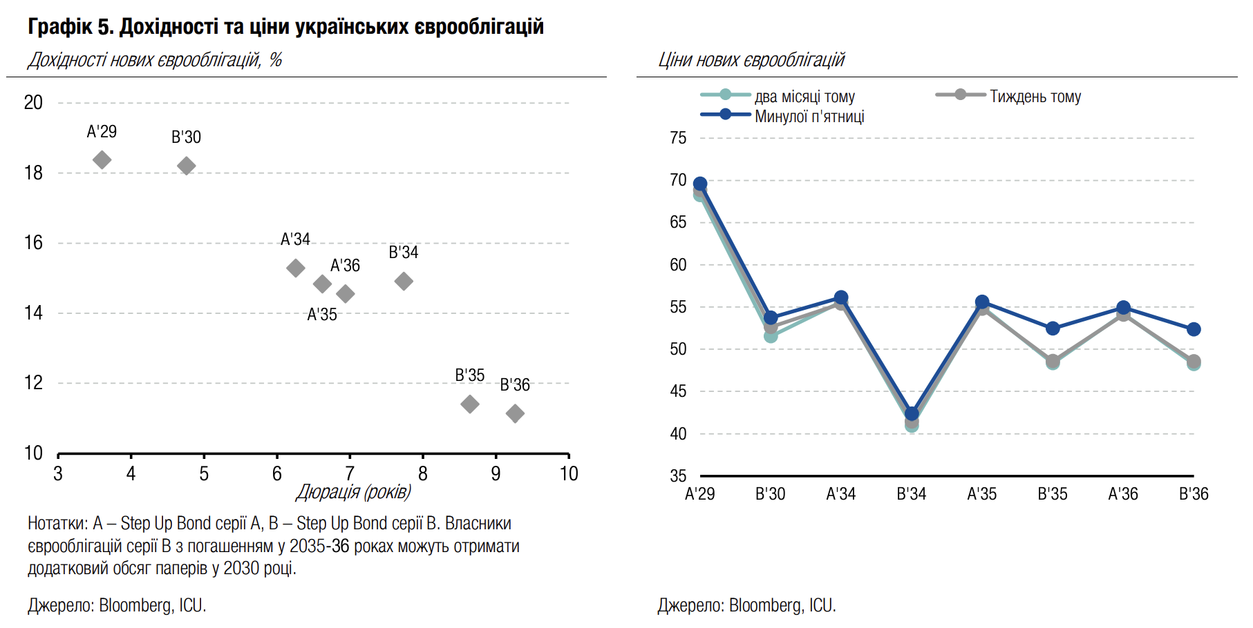 Минулої середи стало відомо, що США планують представити нову версію плану припинення війни в Україні. Цей факт був позитивно сприйнятий інвесторами, і зниження цін єврооблігацій у вівторок надалі змінилося стрімким підвищенням. Однак подальше оприлюднення деталей плану стримало оптимізм, і загалом за тиждень ріст цін виявився переважно незначним: у середньому 1.4% для єврооблігацій серії А та 2% для єврооблігацій серії В з погашенням у 2030 та 2034 роках. Винятком стали лише облігації серії В з погашенням у 2035-36 роках, власники яких потенційно можуть отримати додаткові папери в разі стрімкого відновлення економіки – їхня ціна зросла на майже 8%.