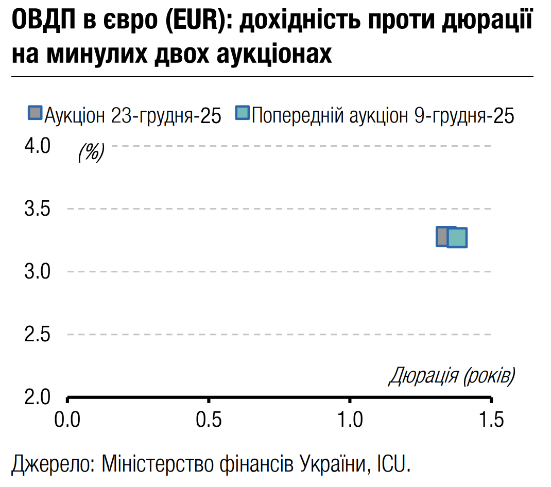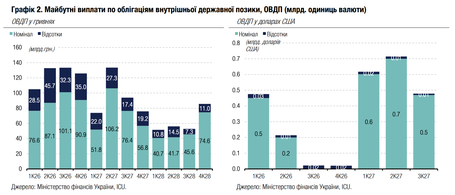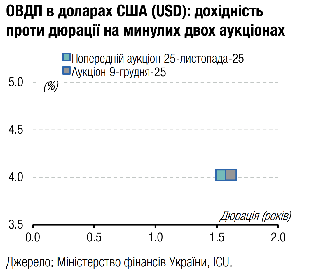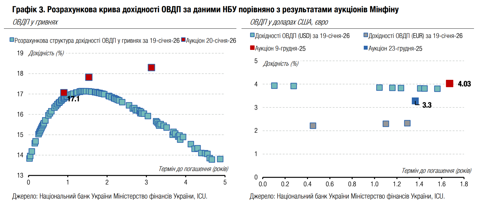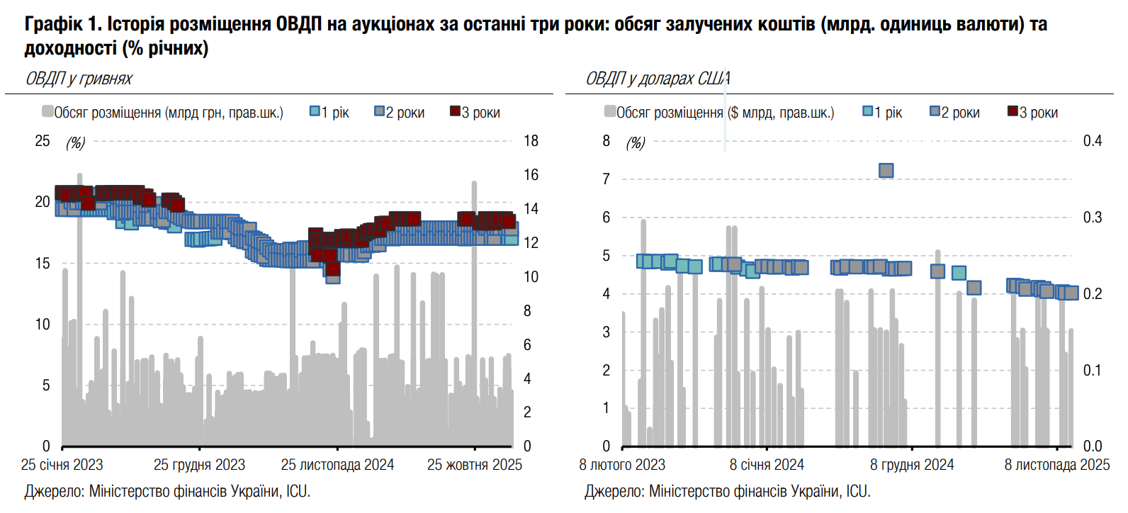 Примітка: [1] по валютних ОВДП обсяг залучених коштів та номінальний обсяг облігацій, що були випущені, наводиться у гривневому еквіваленті за ринковим курсом 42.39/USD, 49.53/EUR;[2] по облігаціях із строком обігу 1 рік і більше наводиться ефективна дохідність до погашення; скорочення в графі "Виплата": К - квартальна виплата купону, ПР - виплата купону кожні півроку, Д - дисконтна облігація з нульовою ставкою купона. Джерела: Міністерство фінансів України, Bloomberg, ICU.