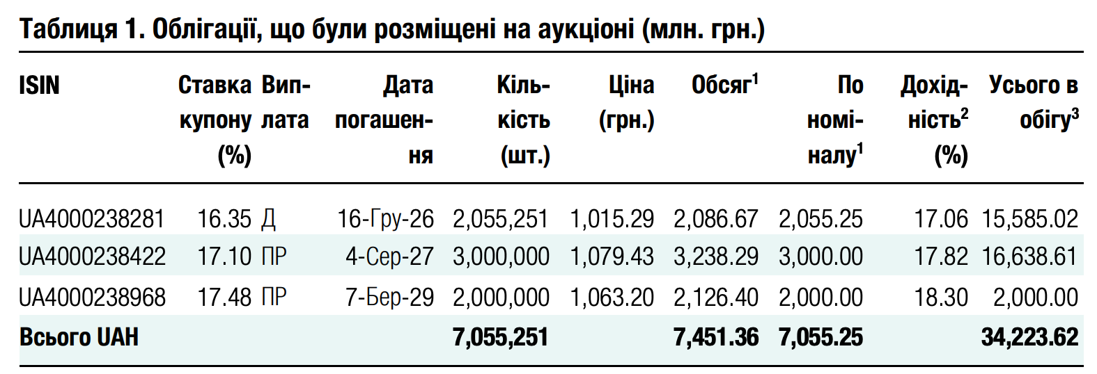 Заявки на придбання нових трирічних паперів були всі зі ставками нижче, ніж за облігаціями з погашенням у листопаді 2028 року, які розміщувалися до минулого тижня. Максимальна ставка в заявках була 17.7% (на 10 б.п. нижче), а мінімальна 17.44%, що на 16 б.п. нижче, ніж зазвичай вона була для таких паперів упродовж майже року.