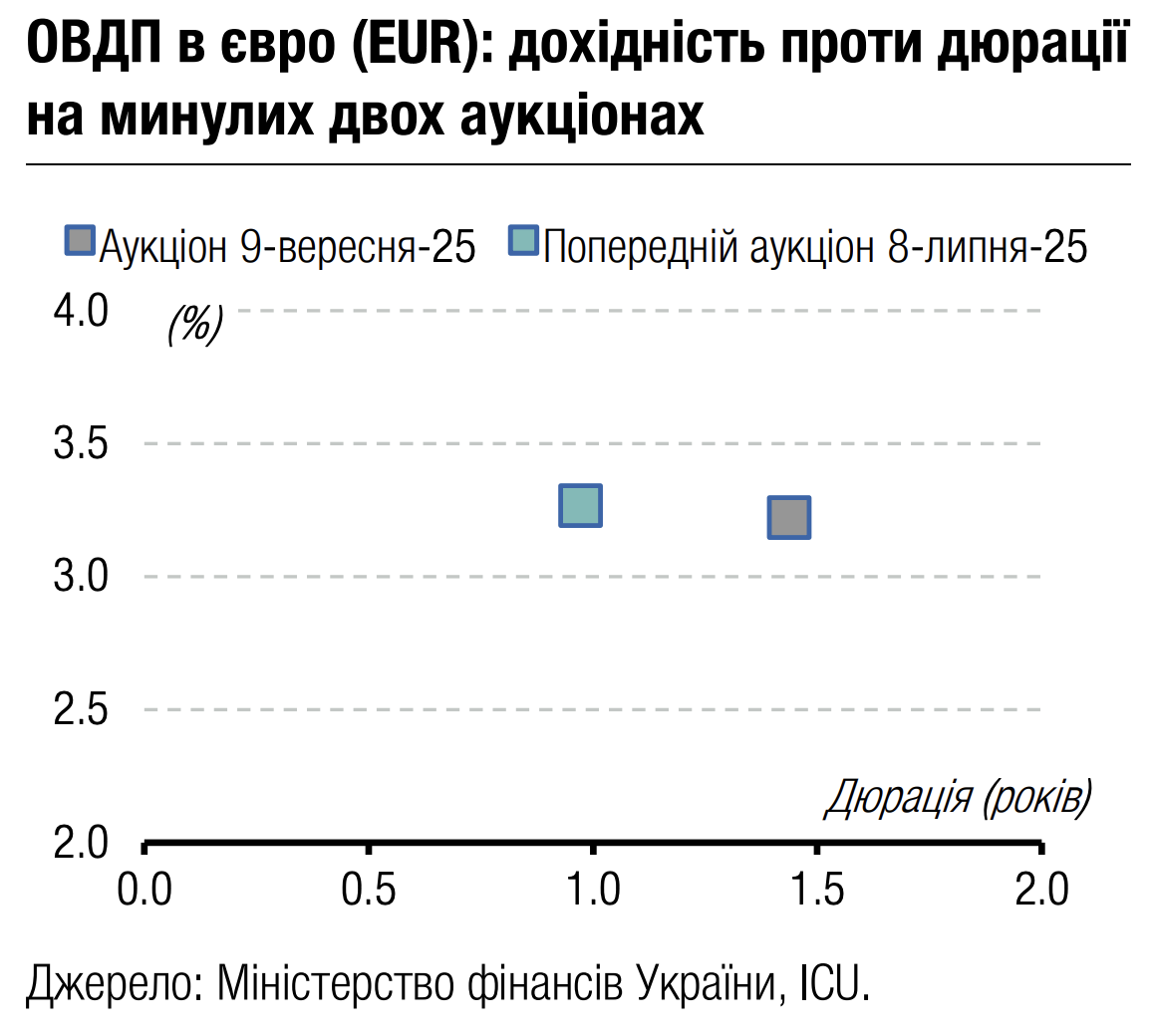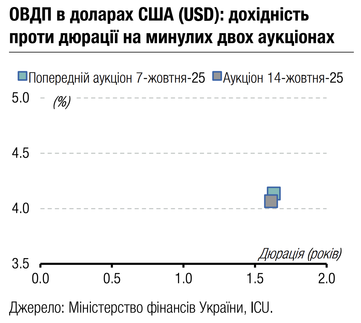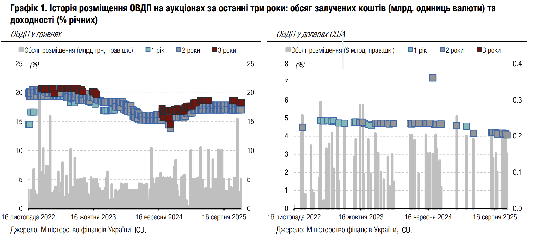 Примітка: [1] по валютних ОВДП обсяг залучених коштів та номінальний обсяг облігацій, що були випущені, наводиться у гривневому еквіваленті за ринковим курсом 41.66/USD, 48.29/EUR;[2] по облігаціях із строком обігу 1 рік і більше наводиться ефективна дохідність до погашення; скорочення в графі "Виплата": К - квартальна виплата купону, ПР - виплата купону кожні півроку, Д - дисконтна облігація з нульовою ставкою купона. Джерела: Міністерство фінансів України, Bloomberg, ICU.
