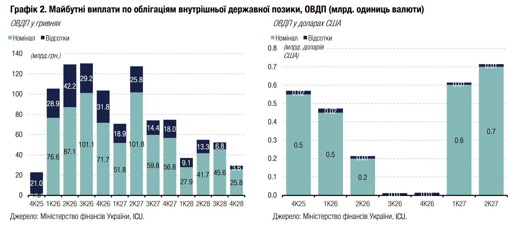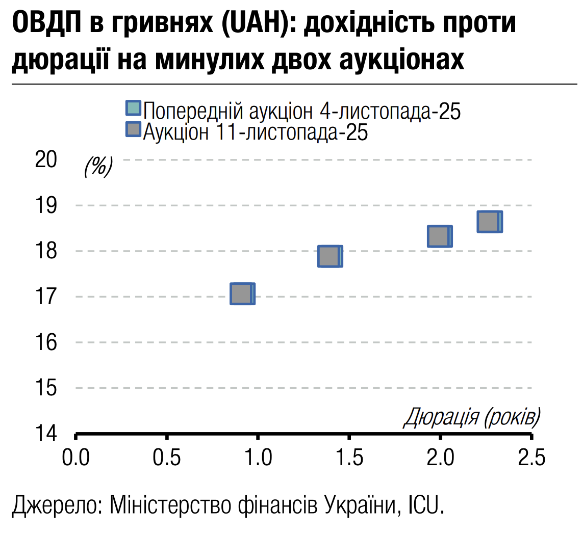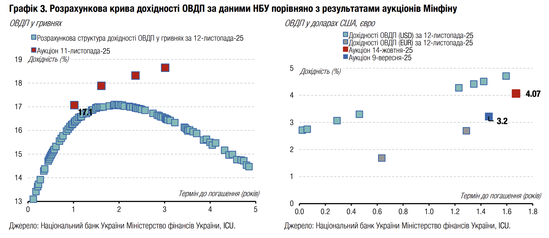 Примітка: [1] по валютних ОВДП обсяг залучених коштів та номінальний обсяг облігацій, що були випущені, наводиться у гривневому еквіваленті за ринковим курсом 41.66/USD, 48.29/EUR;[2] по облігаціях із строком обігу 1 рік і більше наводиться ефективна дохідність до погашення; скорочення в графі "Виплата": К - квартальна виплата купону, ПР - виплата купону кожні півроку, Д - дисконтна облігація з нульовою ставкою купона. Джерела: Міністерство фінансів України, Bloomberg, ICU.
