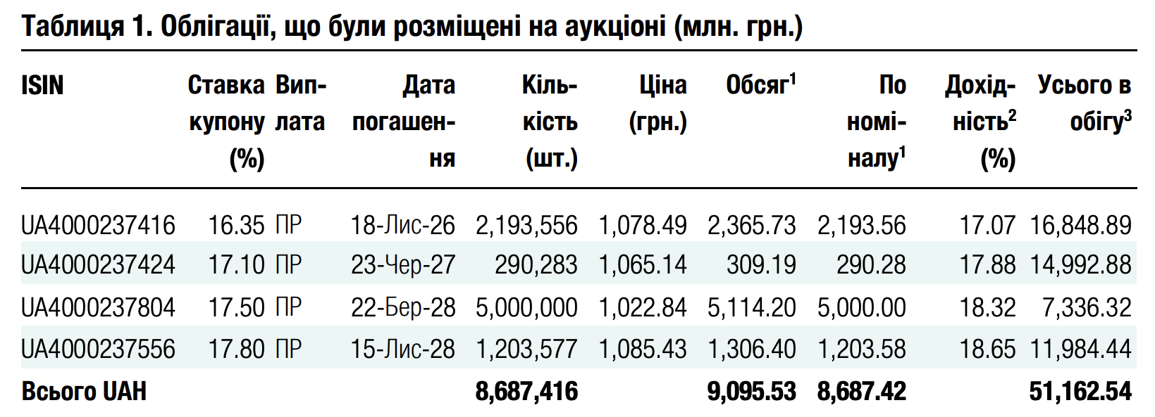 Дохідності в заявках були звичними, тож ставки відсікання та середньозважені за всіма чотирма паперами не зазнали жодних змін.