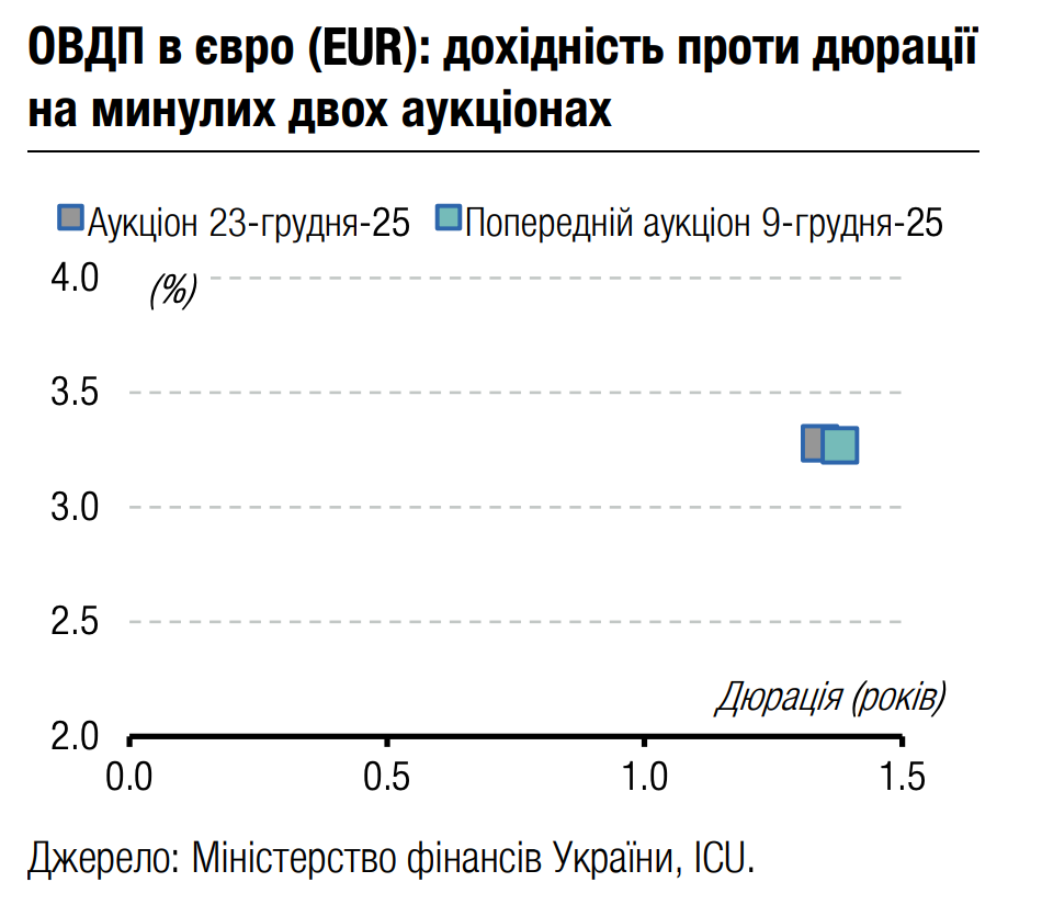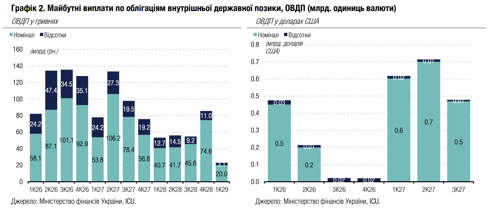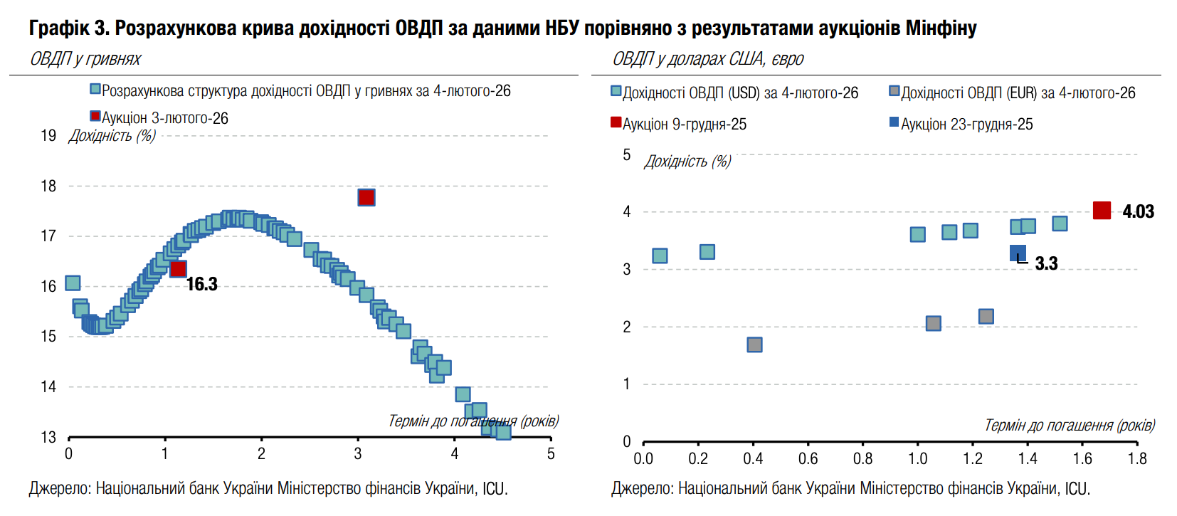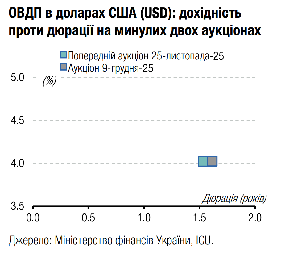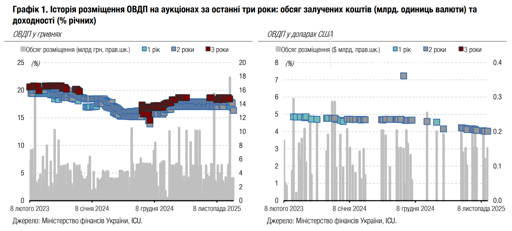 Примітка: [1] по валютних ОВДП обсяг залучених коштів та номінальний обсяг облігацій, що були випущені, наводиться у гривневому еквіваленті за ринковим курсом 42.39/USD, 49.53/EUR;[2] по облігаціях із строком обігу 1 рік і більше наводиться ефективна дохідність до погашення; скорочення в графі "Виплата": К - квартальна виплата купону, ПР -виплата купону кожні півроку, Д - дисконтна облігація з нульовою ставкою купона. Джерела: Міністерство фінансів України, Bloomberg, ICU.