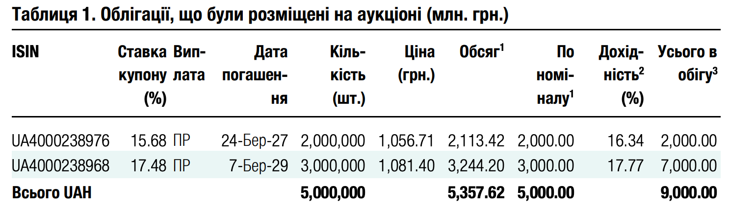 Нові "річні" ОВДП з погашенням у березні наступного року отримали майже десятикратну перепідписку – при пропозиції лише 2 млрд грн облігацій, обсяг заявок становив 19.4 млрд грн. Дохідності в заявках були в досить широкому діапазоні, від 15.68% до 16.35%. Тож згідно з правилами аукціону Мінфін розпочав задовольняти заявки з тих, у яких ставки найнижчі, і від мінімальної ставки не відійшов. Тож і максимальна задоволена ставка, і середньозважена (а також і ставка купону) були встановлені на рівні 15.68% - мінімальному рівні. Усього було задоволено 23 з 69 заявок, і, найімовірніше, всі лише частково.
