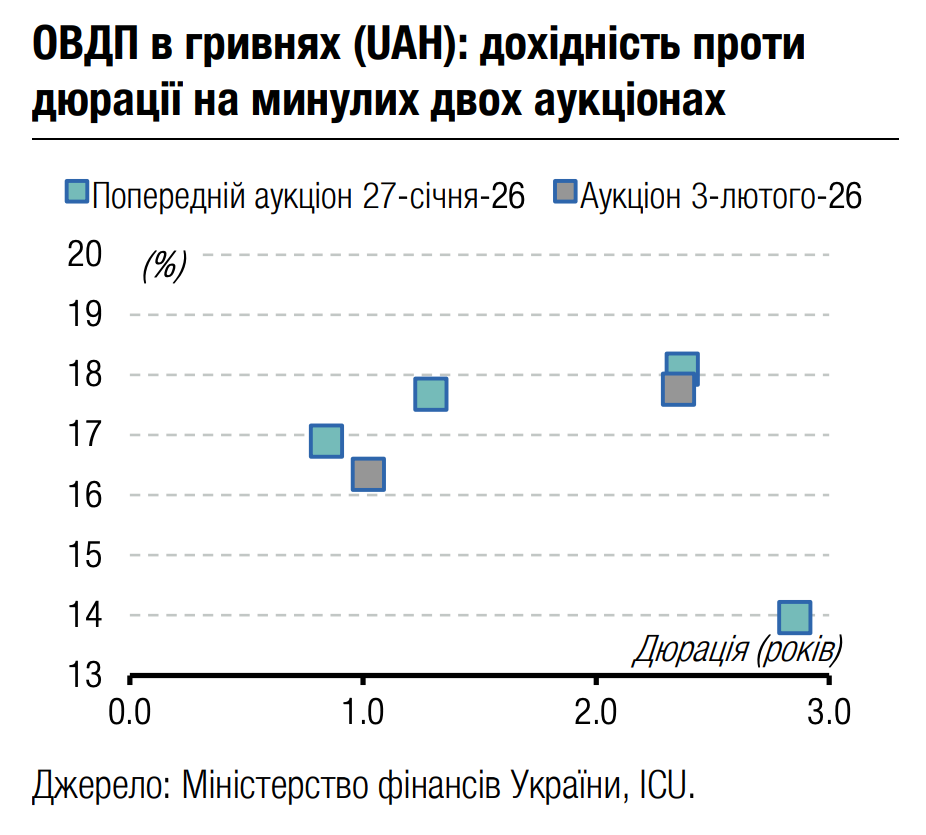 Цілком зрозуміло, що невеликі обсяги пропозиції і перспектива зниження облікової ставки якщо не в березні, то у квітні посилюють бажання інвесторів придбати ОВДП якомога раніше й зафіксувати вищу ставку. Але підвищена конкуренція продовжує штовхати дохідності вниз, і в підсумку зниження ставок за ОВДП може перевищити зменшення облікової ставки НБУ.