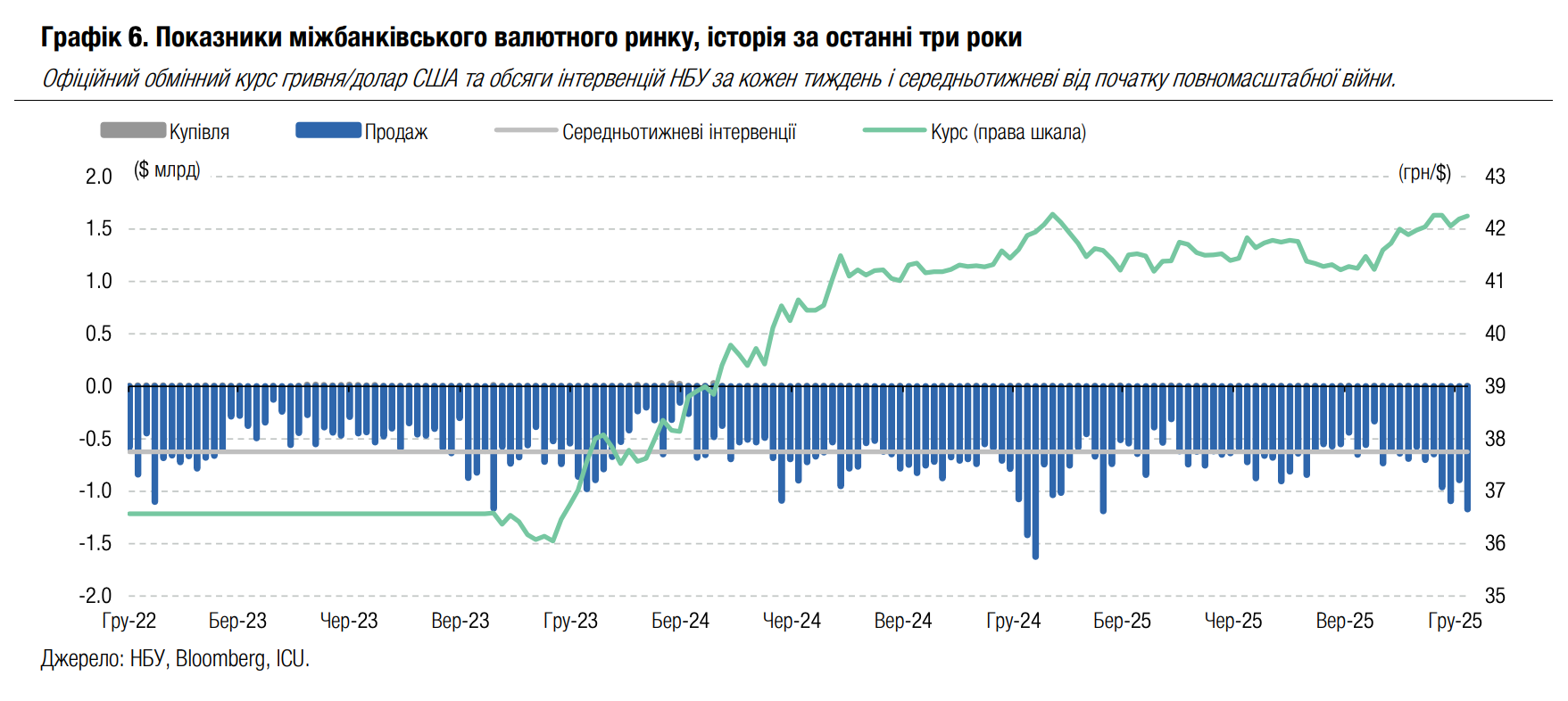 НБУ продав минулого тижня майже $1.2 млрд, що лише на два десятки мільйонів менше від максимуму цього року. Водночас це на $244 млн менше від інтервенцій передостаннього тижня грудня минулого року. На відміну від минулого року, НБУ не пішов на ослаблення курсу гривні та зберіг його неподалік 42.2 грн/$, ослабивши за тиждень лише на 5 копійок до 42.25 грн/$, або лише на 0.1%.
