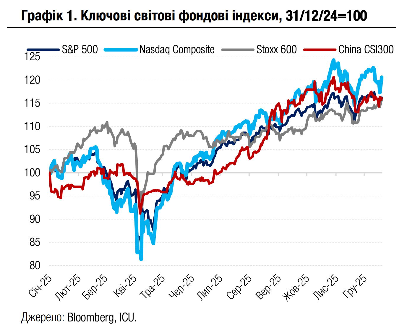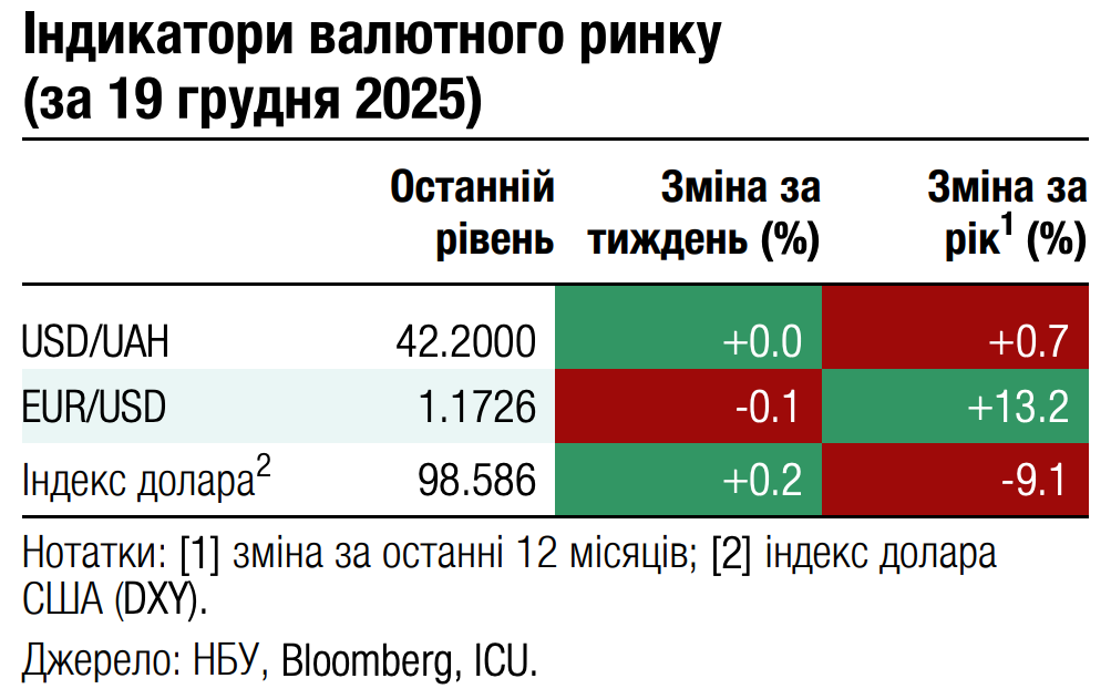 Також незначно зміг укріпитись за тиждень провідний індекс акцій США S&P 500. Акції сектору високих технологій після початкового відставання змогли наприкінці тижня трохи випередити S&P 500, в основному завдяки сильному фінансовому звіту американського виробника напівпровідників Micron Technology. У результаті сфокусований на техно-секторі індекс Nasdaq 100 зріс за тиждень на 0.6%. Водночас європейський Stoxx 600 завершив тиждень зі зростанням 1.6% через високий попит на акції секторів страхування й оборонної промисловості. Європейський ринок акцій також вітав рішення ЄС надати Україні фінансову допомогу на 2026-27 рр. без використання заморожених російських активів.