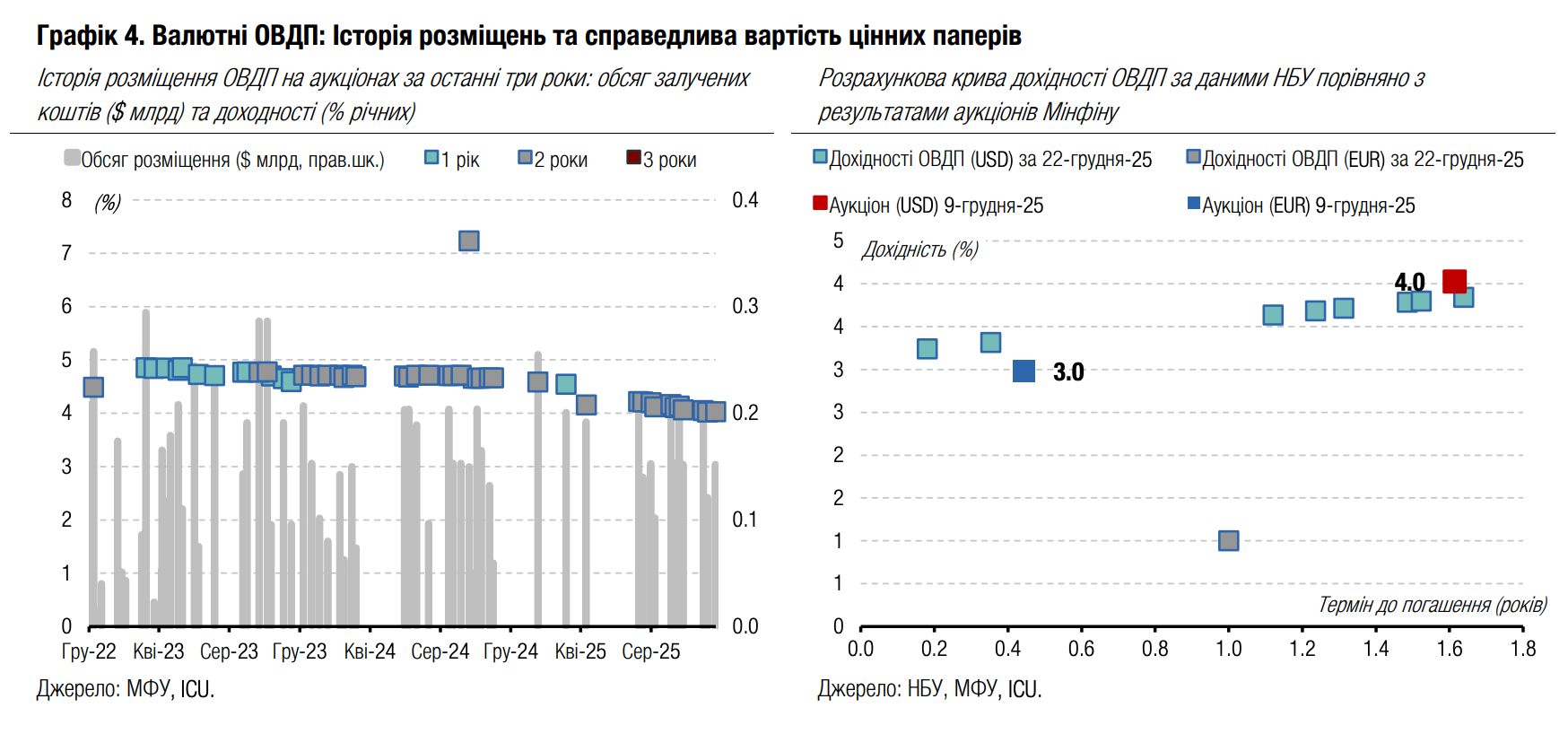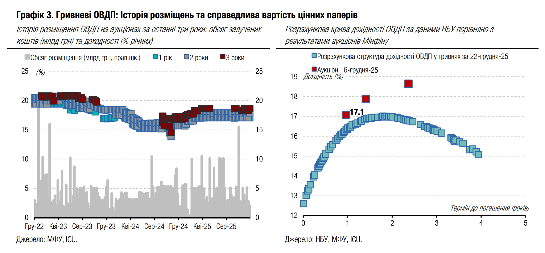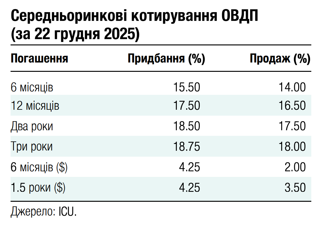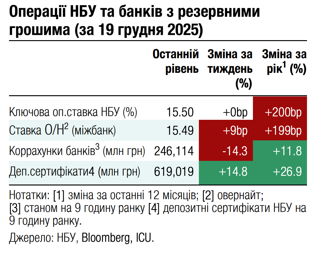 Погляд ICU: Наразі все більше посилюються очікування зниження облікової ставки НБУ в січні. Ключовий ризик, який стримував НБУ від переходу до циклу пом’якшення монетарної політики, наразі майже усунуто. Минулого тижня ЄС прийняв рішення виділити Україні 90 млрд євро позики, яку профінансують через спільні запозичення ЄС. Тож до наступного перегляду облікової ставки наприкінці січня НБУ вже матиме повне бачення перспектив міжнародної допомоги на період 2026-27 років.
