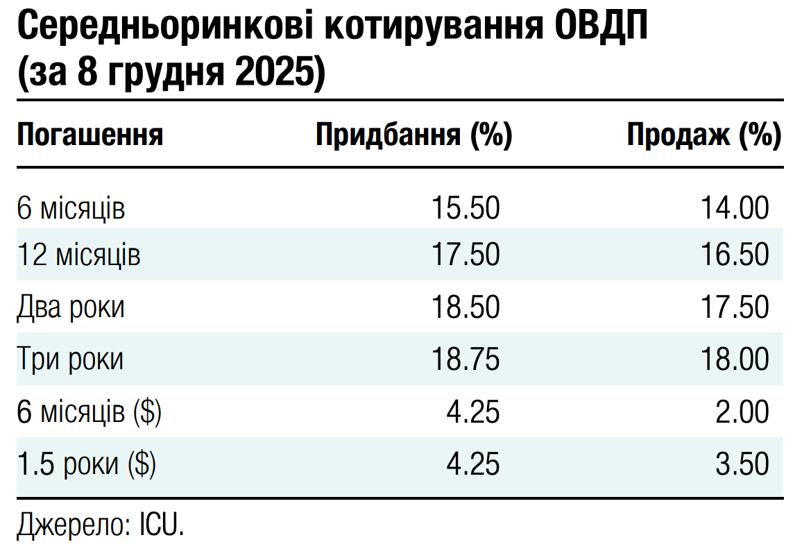 У вівторок москву відвідали представники США С.Уіткофф та Д.Кушнер, які представили мирний план, погоджений між Україною, США та ЄС. Однак путін очікувано відхилив цей мирний план, наполягаючи фактично на капітуляції України. Тож ще у вівторок єврооблігації почали дешевшати, і за підсумками першого тижня грудня ціни знизилися на майже 5%.