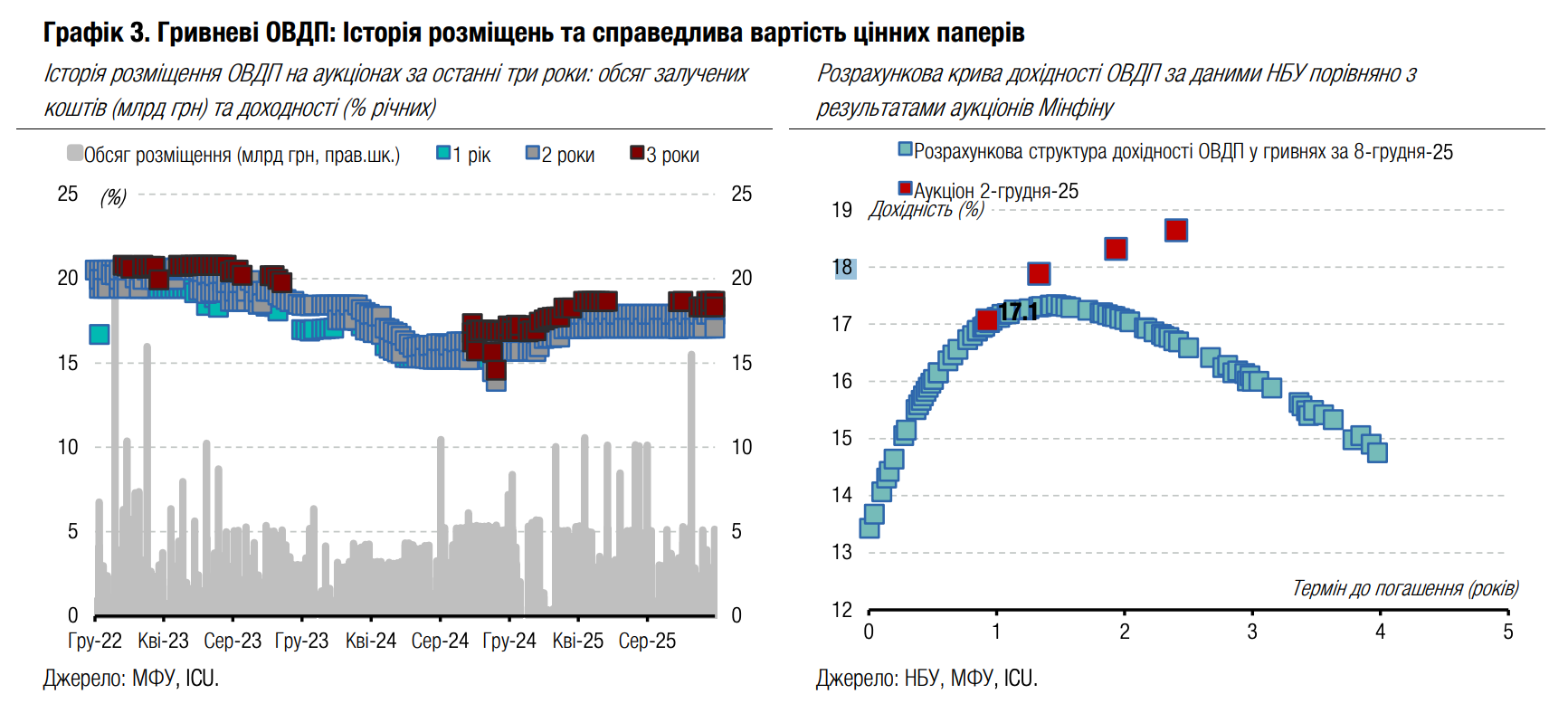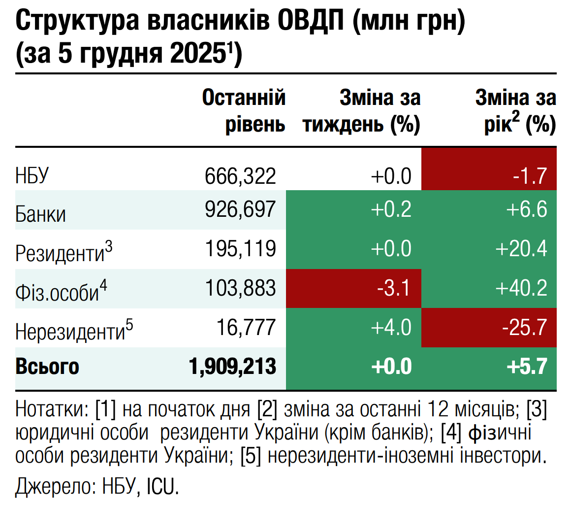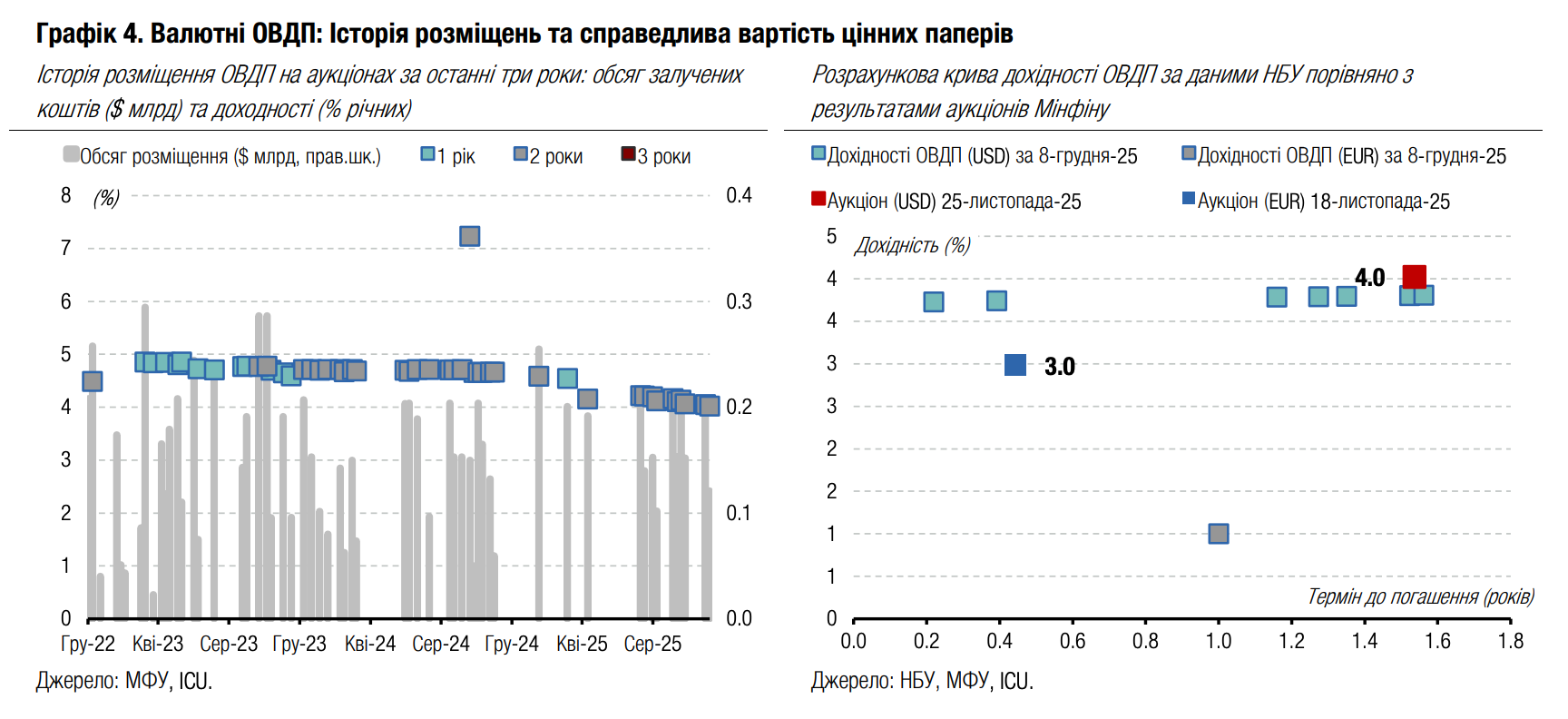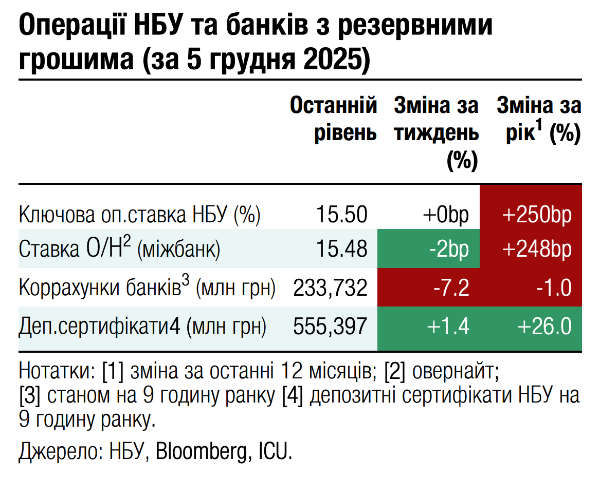 Погляд ICU: Обсяги вже обіцяної українськими партнерами допомоги на 2026 рік складають близько $20 млрд. Ще частина коштів, отриманих цьогоріч, залишиться для використання наступного року (передфінансування на 2026 рік, що отримане у 2025 році). Загалом же станом на сьогодні близько половини дефіциту бюджету залишається непокритою. Тож питання репараційної позики від ЄС (або альтернативного інструменту) набуває критичного значення для України. Європейська рада планує його розглянути на своєму наступному засіданні 18-19 грудня