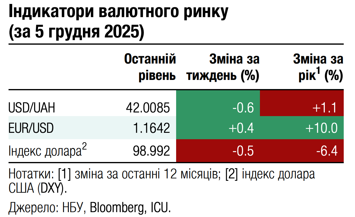 Діапазон коливань курсу гривні минулого тижня розширився, адже після досягнення 42.5 грн/$ у листопаді, ринкові котирування в п'ятницю змістилися до рівня, близького до 42 грн/$. Офіційний курс гривні НБУ встановив на сьогодні на рівні 42.06 грн/$, зміцнивши його на 0.5% за тиждень і на 0.8% порівняно з цьогорічним максимумом, зафіксованим у листопаді.
