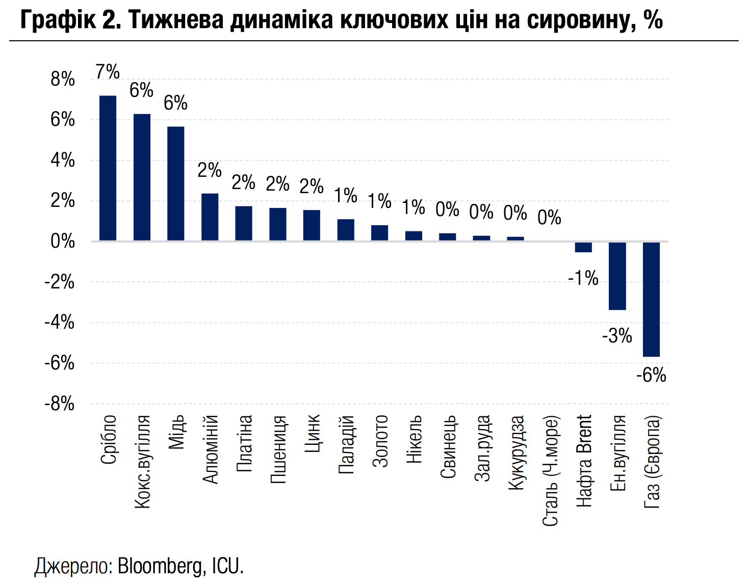 На ринках сировини продовжився тренд подорожчання дорогоцінних металів, у тому числі золота на 1% за тиждень, срібла на 7%. Водночас ціни на природний газ у Європі знову зазнали найбільшого падіння (-6%) на тлі очікувань більш ніж достатньої пропозиції.