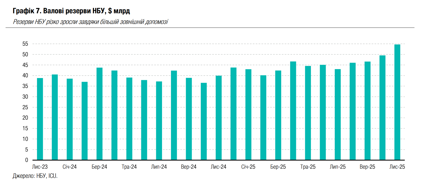 Значні припливи міжнародної фінансової допомоги в листопаді збільшили резерви НБУ до нового рекордного рівня $54.7 млрд (+11% у листопаді та +25% від початку року).