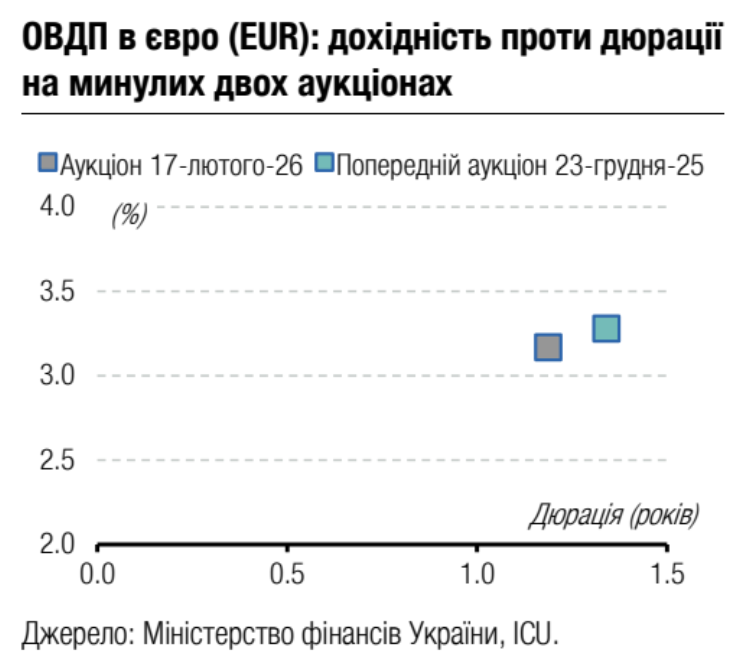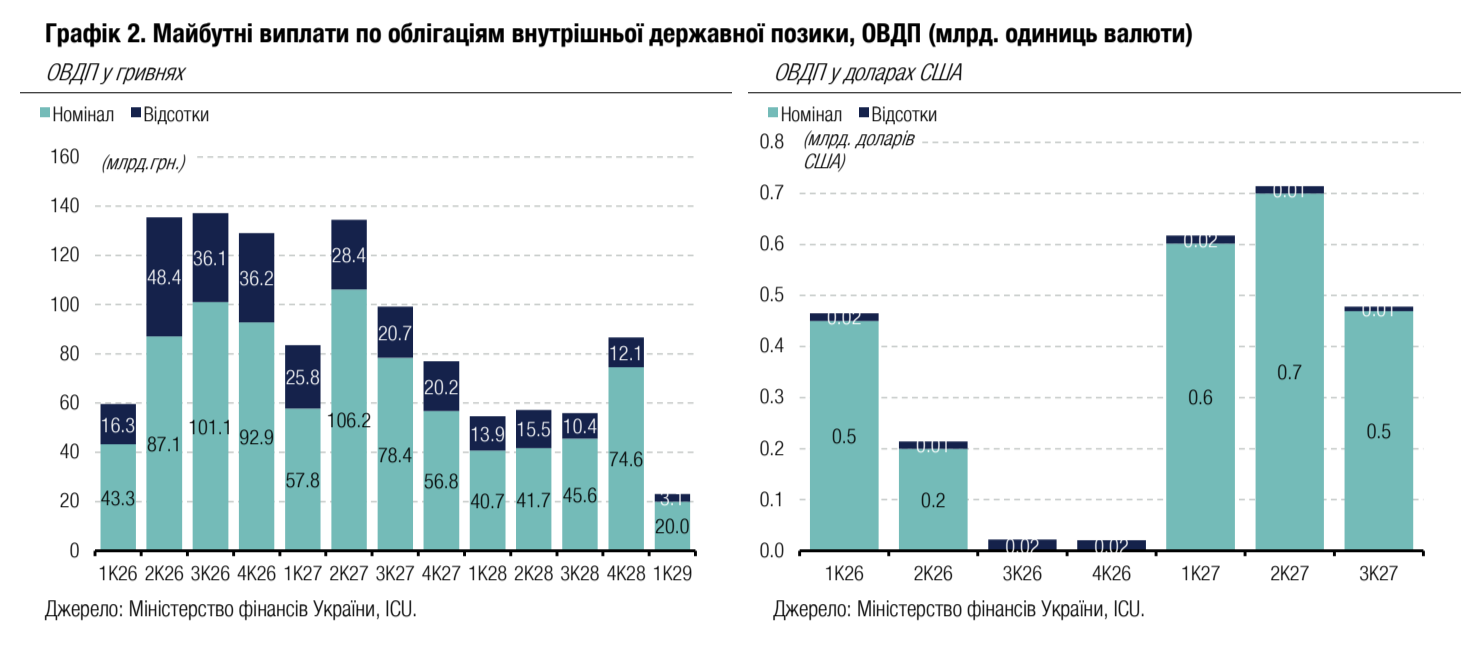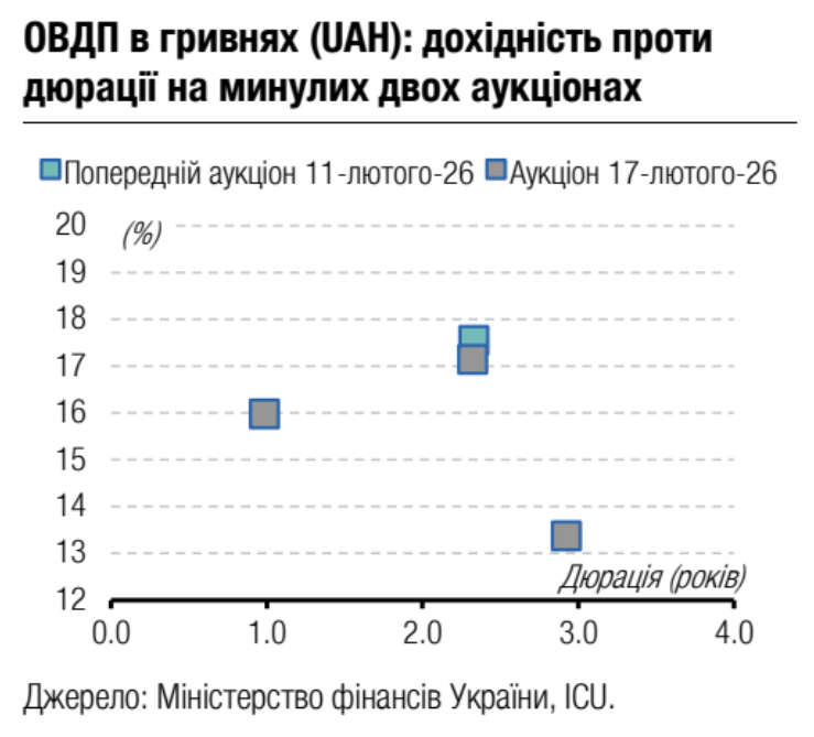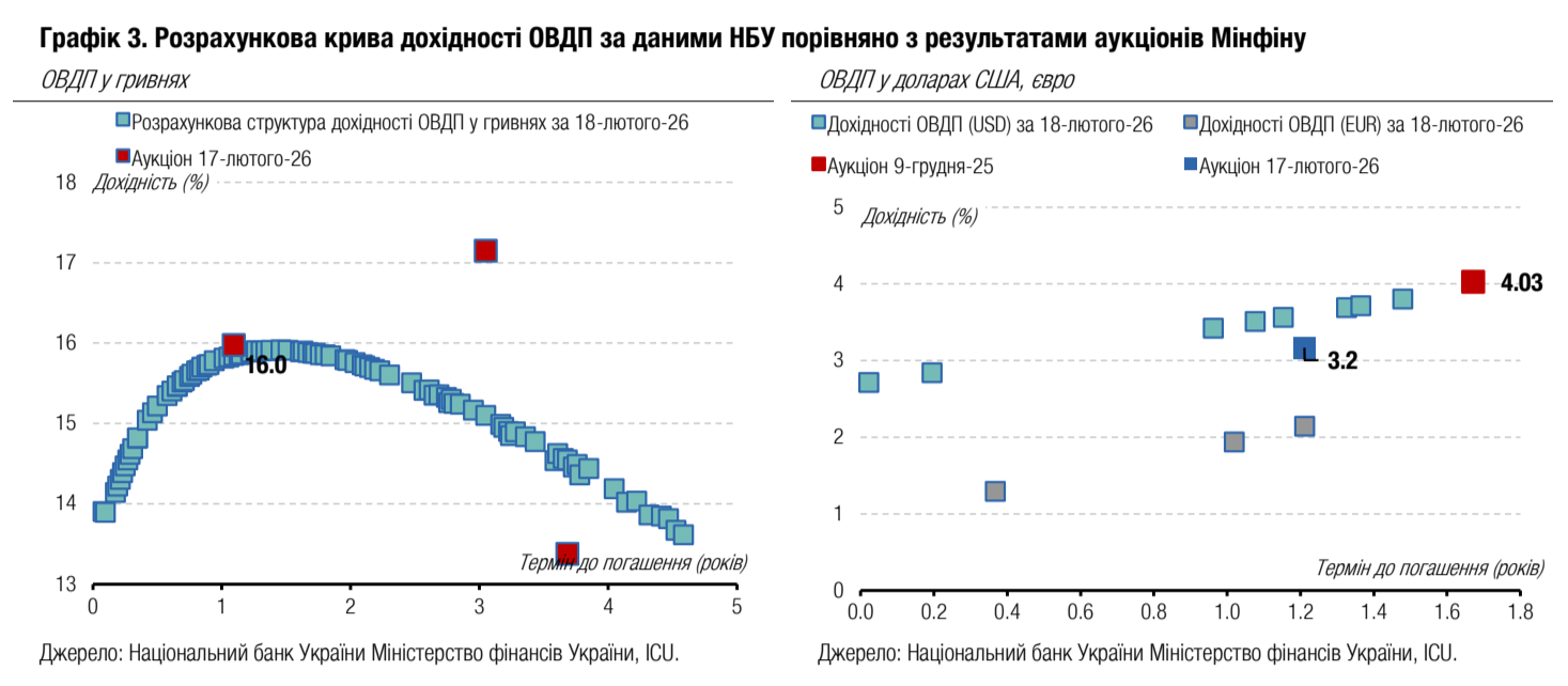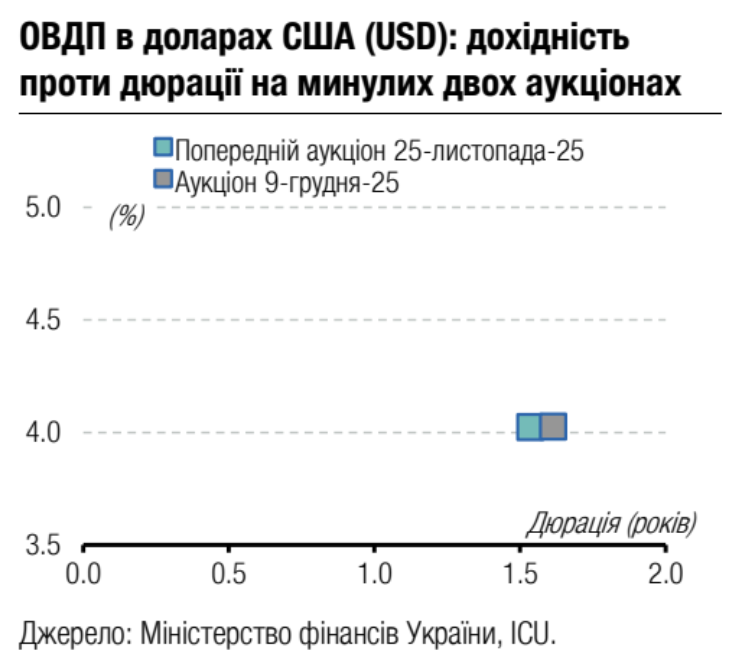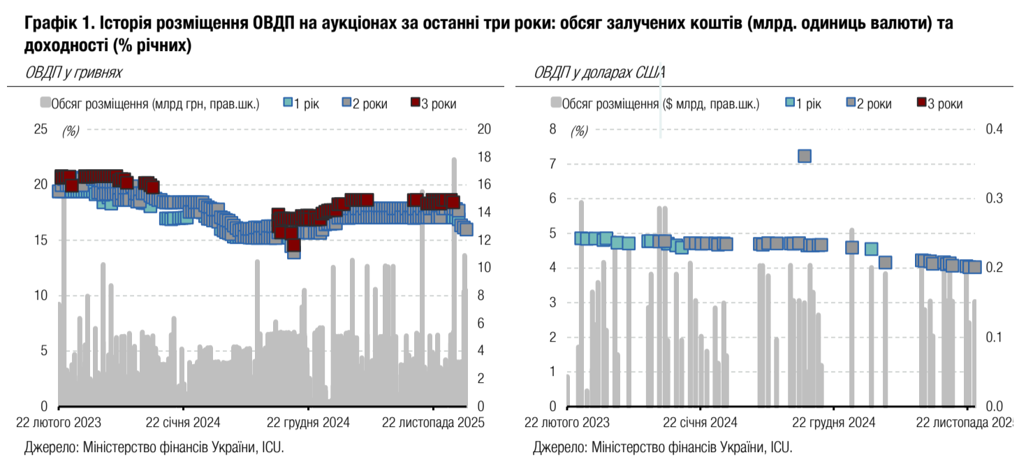 Примітка: [1] по валютних ОВДП обсяг залучених коштів та номінальний обсяг облігацій, що були випущені, наводиться у гривневому еквіваленті за ринковим курсом 42.39/USD, 51.29/EUR;[2] по облігаціях із строком обігу 1 рік і більше наводиться ефективна дохідність до погашення; скорочення в графі "Виплата": К - квартальна виплата купону, ПР - виплата купону кожні півроку, Д - дисконтна облігація з нульовою ставкою купона. Джерела: Міністерство фінансів України, Bloomberg, ICU.