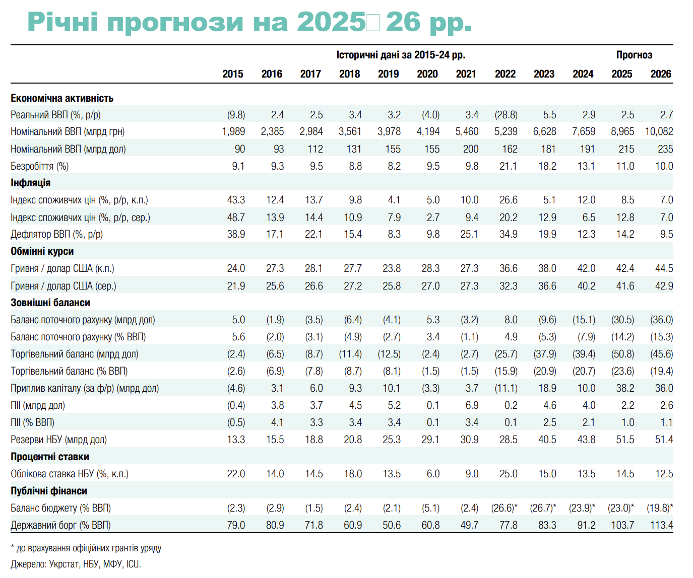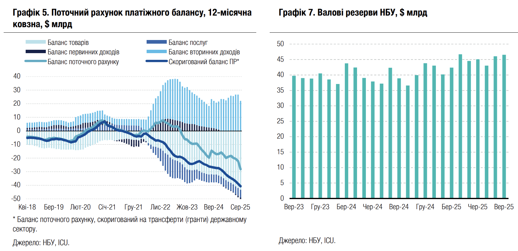 Рекордний дефіцит поточного рахунку є одним із ключових довгострокових викликів для економіки, проте в середньостроковій перспективі він буде повністю перекритий зовнішньою допомогою. З урахуванням цього ми дещо покращуємо прогноз обмінного курсу – 42.4 грн/$ наприкінці 2025 року та 44.5 грн/$ наприкінці 2026 року. Ми переконані, що зростання зовнішніх дисбалансів (без урахування зовнішньої допомоги) все ж змусить НБУ відмовитися від де-факто фіксованого обмінного курсу та розпочати повільне послаблення гривні.