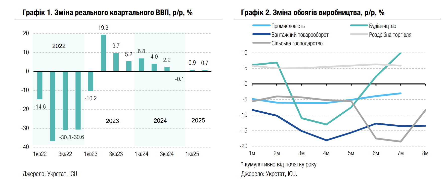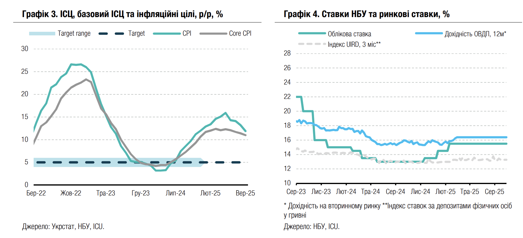 Економічне зростання залишатиметься пригніченим найближчим часом, якщо безпекові ризики не знизяться суттєво. Інфляція сповільнюється високими темпами, дезінфляційний тренд перевищує очікування НБУ. Темпи зростання цін майже на всі складові споживчого кошика сповільнюються, що вказує на сталість дезінфляційного процесу. Водночас ми не вважаємо, що досягнення інфляційної цілі НБУ можливе в найближчій перспективі. Усе ж із урахуванням поточного балансу ризиків ми очікуємо переходу НБУ до циклу поступового пом’якшення монетарної політики вже наступного тижня. За нашими очікуваннями, облікова ставка наприкінці поточного року складатиме 14.5%. Наступного ж року зниження ставки може бути більш суттєвим, якщо репараційний кредит для України буде затверджено.