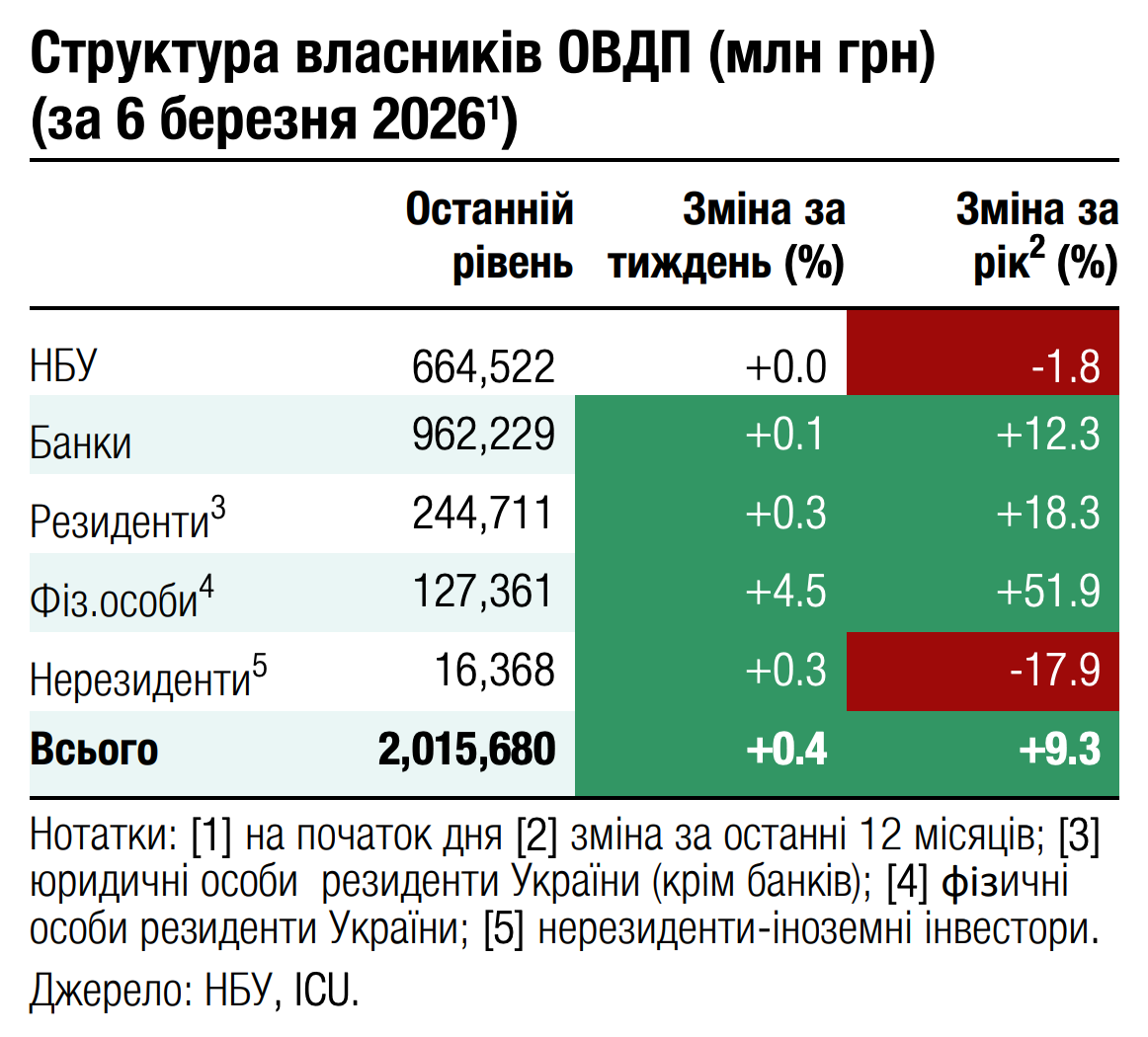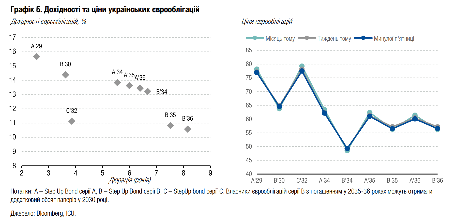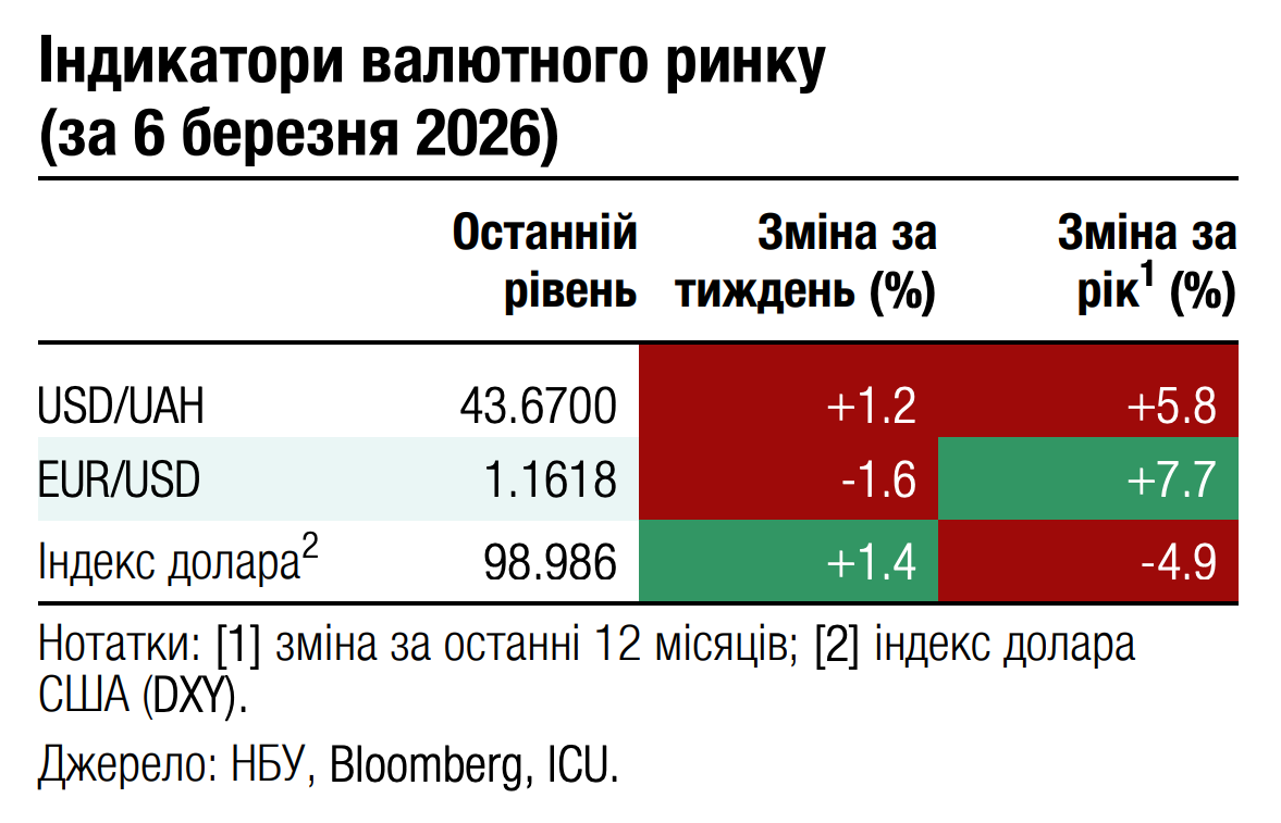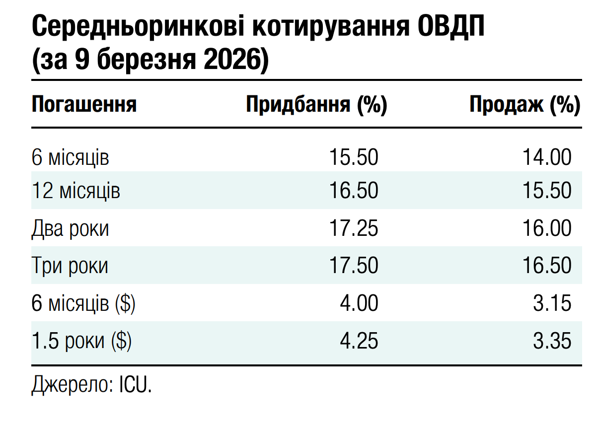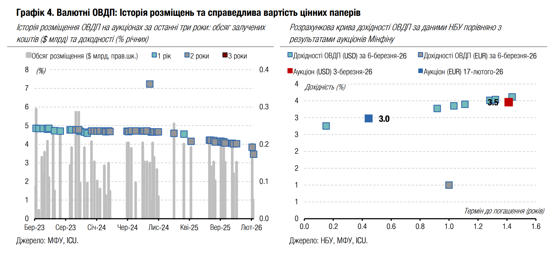 Відсутність будь-якого просування в мирних переговорах знову продемонструвала, що позитивні очікування від тристоронніх зустрічей США, України та росії були перебільшені. Ціни українських єврооблігацій почали знижуватися ще в середині лютого. З початком війни в Ірані загальний сентимент до боргових ринків країн, що розвиваються, помітно погіршився – індекс EMBI за минулий тиждень впав на 1.6%. Глобальний сентимент лише посилив зниження цін українських паперів, що перевищило 5% за попередні три тижні.
