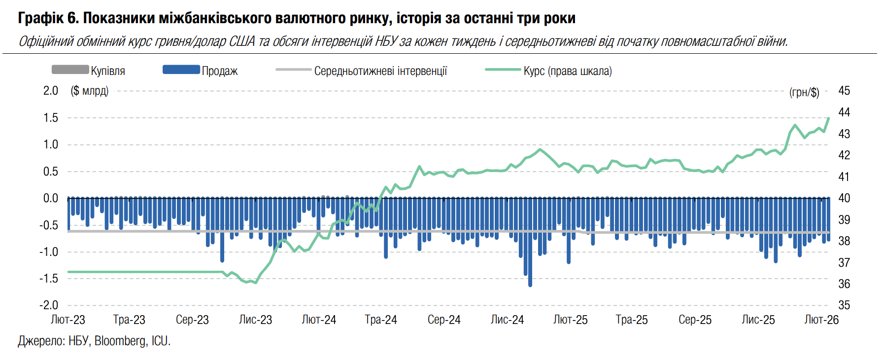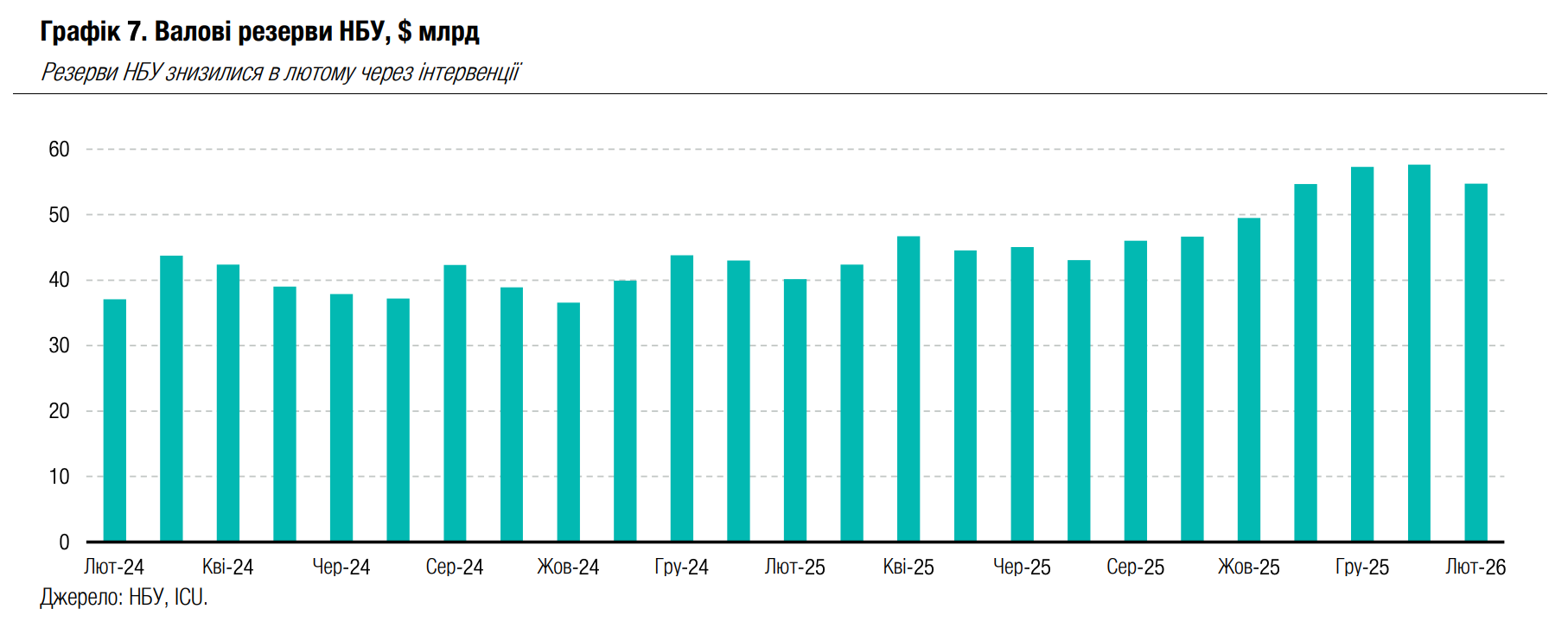 Погляд ICU: Значне скорочення резервів у лютому переважно пов’язане з нерівномірним графіком надходжень зовнішньої фінансової допомоги. Ми очікуємо, що резерви НБУ протягом усього року знаходитимуться на рівні понад $50 млрд, адже запланованих обсягів зовнішньої допомоги достатньо, щоб повністю задовольнити потреби НБУ на проведення інтервенцій. Можлива затримка з надходженням Ukraine Support Loan від ЄС через блокування Угорщини є фактором ризику, проте вона не послабить спроможність НБУ повною мірою контролювати валютний ринок та обмінний курс гривні.