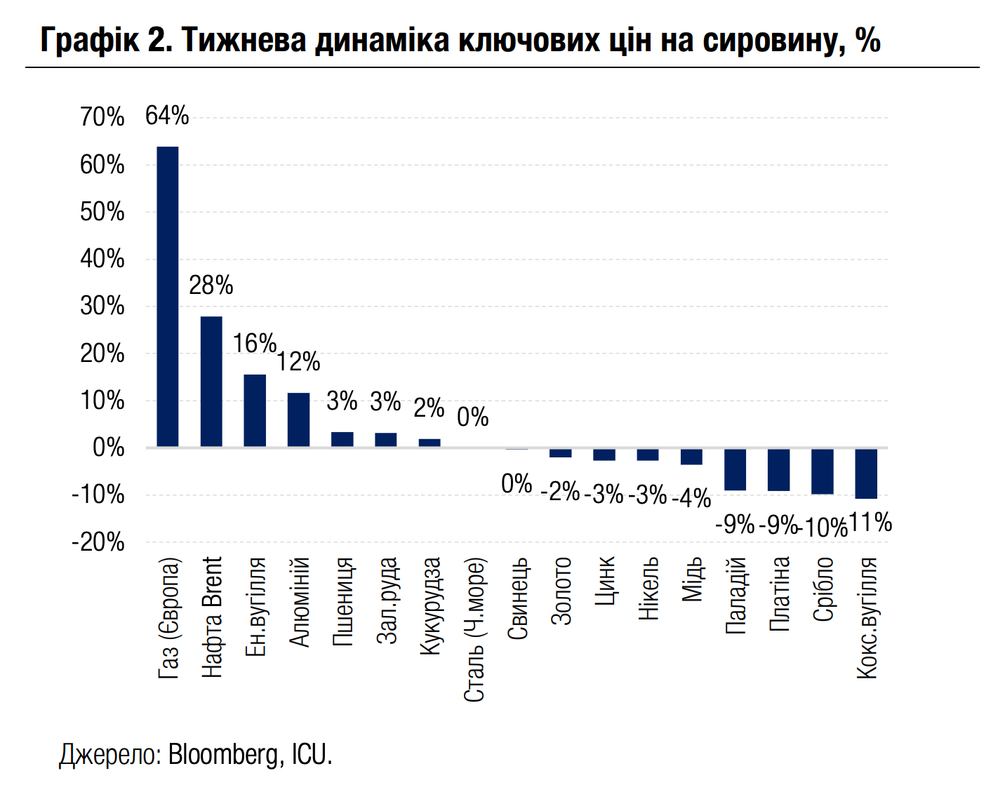 За підсумками тижня індекси S&P 500 і Nasdaq 100 втратили за тиждень 2% і 1.3% відповідно. Ще більше постраждав європейський Stoxx 600 (-5.5%). Водночас ціни на нафту злетіли за тиждень на 28% до $92.7 за барель марки Brent, а ціни на природний газ у Європі – на 64% до $653 за тис. куб. м. Страхи прискорення інфляції через високі ціни енергоносіїв тиснули також на вартість облігацій. Головний індикатор боргових ринків – дохідності казначейських облігацій США – зросли за тиждень на 20 б.п. до 4.14% для десятирічних інструментів. Дохідності десятирічних німецьких бундів злетіли на 22 б.п. до 2.86%, а британських гілтів – на 39 б.п. до 4.62%. Індекс вартості єврооблігацій країн, що розвиваються, EMBI, втратив за тиждень 1.6%. Водночас індекс долара DXY укріпився на 1.4%. Котирування на золото після трьох тижнів зростання відступили минулого тижня на 2%.