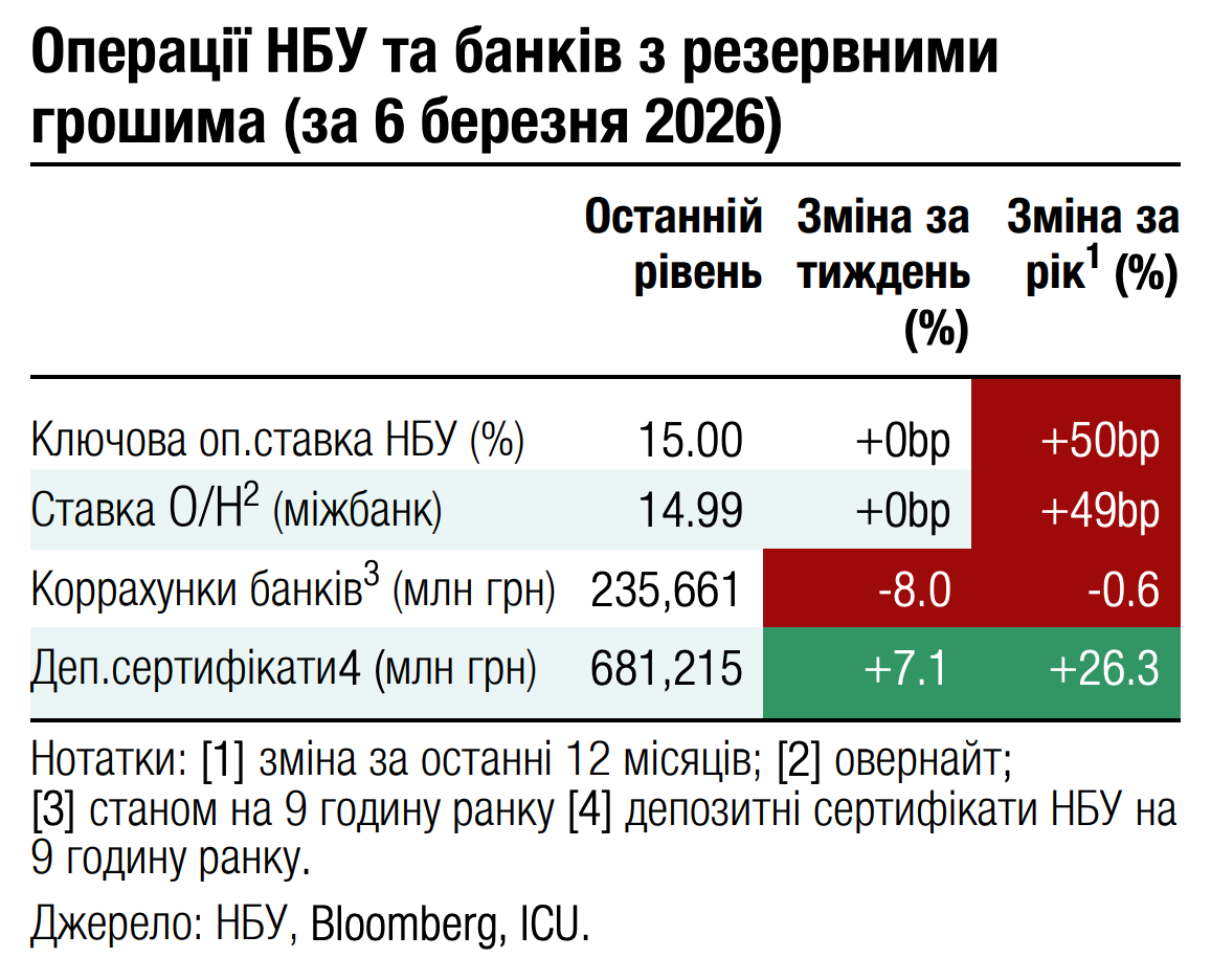 Погляд ICU: Війна в Ірані опосередковано зачепила й Україну як через зміну акцентів у новинах, так і через вимушену паузу в мирних переговорах. Наразі події в Ірані скоріш мають негативний характер через можливе зменшення постачання критично важливих боєприпасів для України, зокрема ракет для ППО. Наступний раунд переговорів, що мав відбутися минулого тижня, було відкладено через війну в Ірані, тож найближчим часом інвестори навряд чи отримають нову важливу інформацію про перспективи завершення війни.