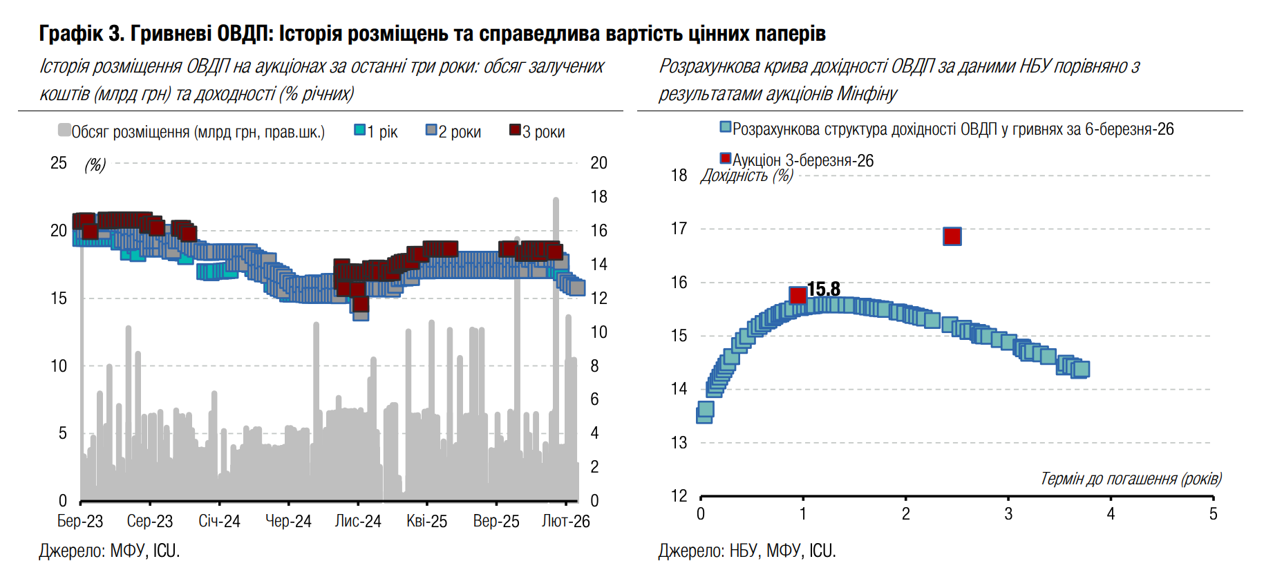 Погляд ICU: У Міністерства фінансів наразі вже залишилося досить мало простору для подальшого зниження дохідностей на первинному ринку до наступного рішення НБУ щодо зменшення облікової ставки. Адже наразі облікова ставка НБУ 15%, а дохідності річних ОВДП на первинному ринку 15.1%-15.19%. Тож без перегляду прогнозів НБУ щодо траєкторії облікової ставки Мінфіну буде дуже складно коригувати дохідності річних ОВДП. Однак за довшими паперами Мінфін може й далі намагатися зменшити премію за строковість із поточних 50 б.п. за кожен додатковий рік обігу до орієнтовно 40 б.п.