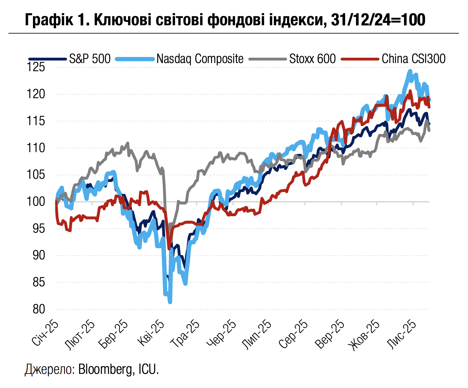 Страхи щодо ставок посилили сумніви в обґрунтованості високої ринкової вартості акцій компаній IT-сектору. Зокрема, ціна акцій провідного виробника мікросхем Nvidia впала за тиждень на 3%: їхні розпродажі особливо прискорилися після того, як стало відомо, що SoftBank вирішив повністю розпродати свою позицію в Nvidia загальною вартістю $5.8 млрд. Водночас головний конкурент Nvidia компанія Advanced Micro Devices заявила, що очікує прискорення зростання доходів від продажів до 35% протягом наступних трьох-п’яти років, що допомогло її акціям зрости на 2% за тиждень. У тижневому підсумку американські індекси S&P 500 і Nasdaq 100 залишились майже незмінними (+0.1% і -0.2% відповідно). Водночас європейський Stoxx 600 завершив тиждень зі зростанням 1.8% завдяки меншій частці і відповідно меншому впливу IT-сектору, а також сильним фінансовим звітам за 3кв25 низки європейських компаній.