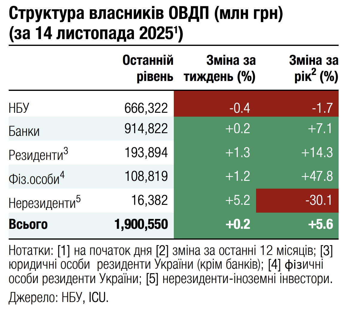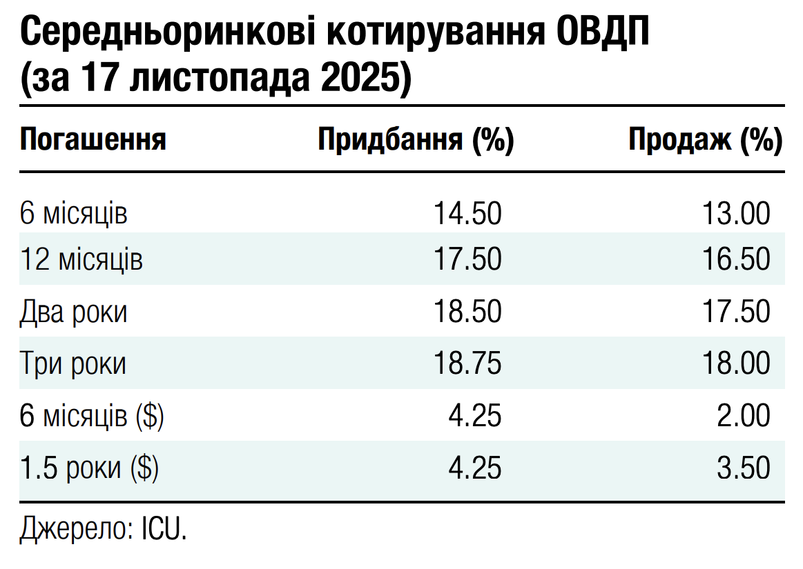 Загальний обсяг торгів гривневими ОВДП на вторинному ринку минулого тижня склав 9.1 млрд грн, де угоди з паперами з терміном погашення до одного року складали майже 4 млрд грн. Це були переважно папери з терміном обігу 9-10 місяців з погашенням у серпні-вересні наступного року. Обсяг угод з ОВДП, які погашатимуться впродовж наступних шести місяців складав лише 100 млн грн.
