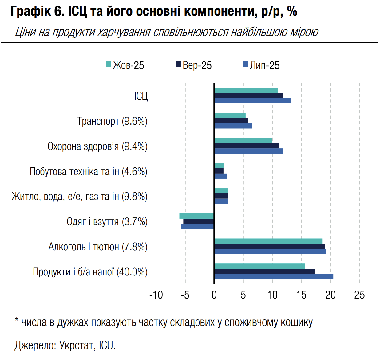 Найбільший позитивний ефект дали продукти харчування – найбільша складова споживчого кошика – ціни на них сповільнилися до 15.4% з 17.2% раніше. Сповільнення споживчих цін у річному вимірі стосувалося широкої групи товарів та послуг. Окрім продуктів харчування, помітними зміни були в сегменті охорони здоров’я (9.9% р/р в жовтні порівняно з 11.1% у вересні) та зв’язку (16.4% порівняно з 17.1%).