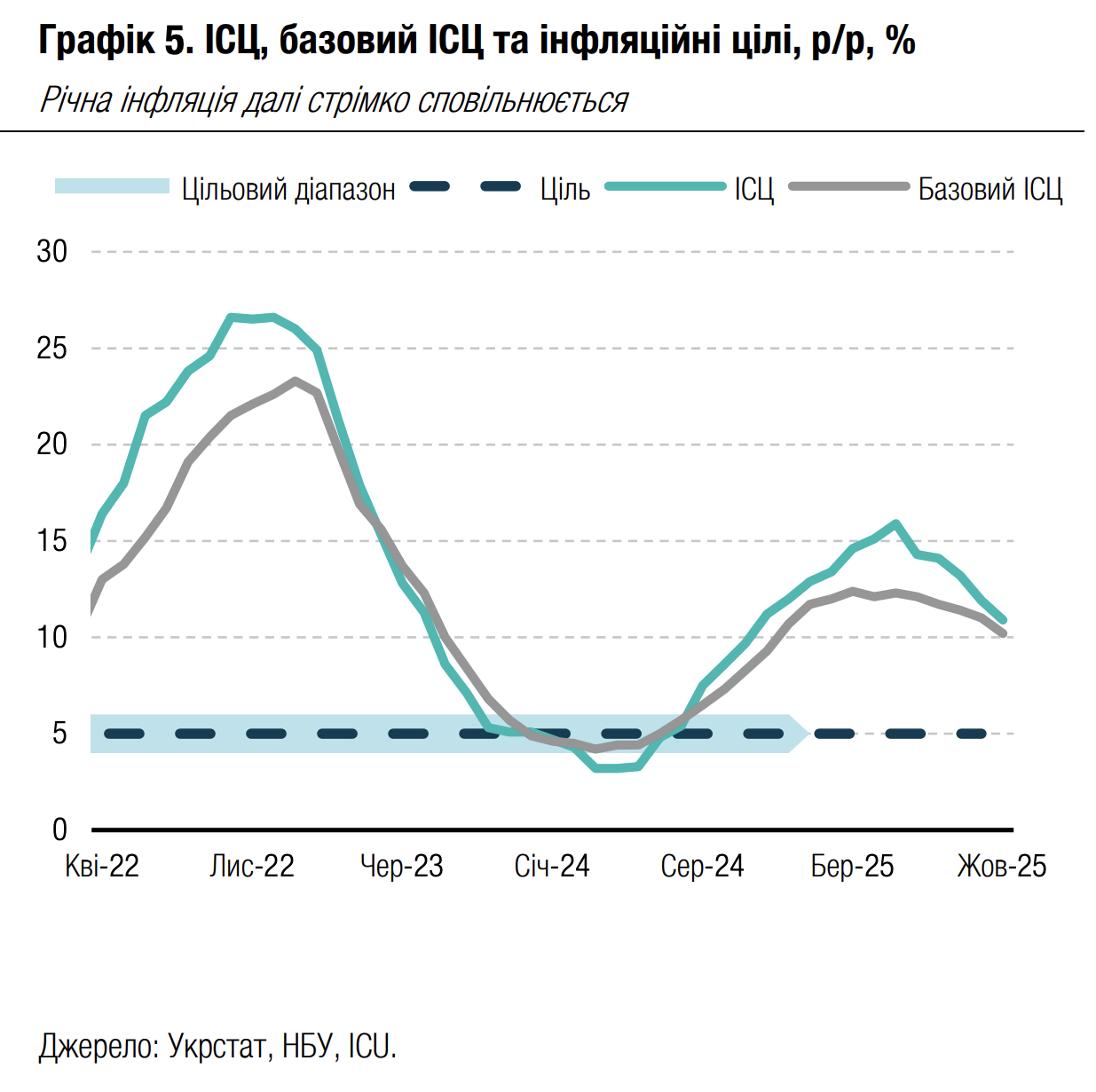 Темпи зростання споживчих цін сповільнилися до 10.9% у жовтні порівняно з 11.9% р/р у вересні та піковим значенням 15.9% у травні. Показник базової інфляції знизився до 10.2% р/р з 11.0% у вересні.