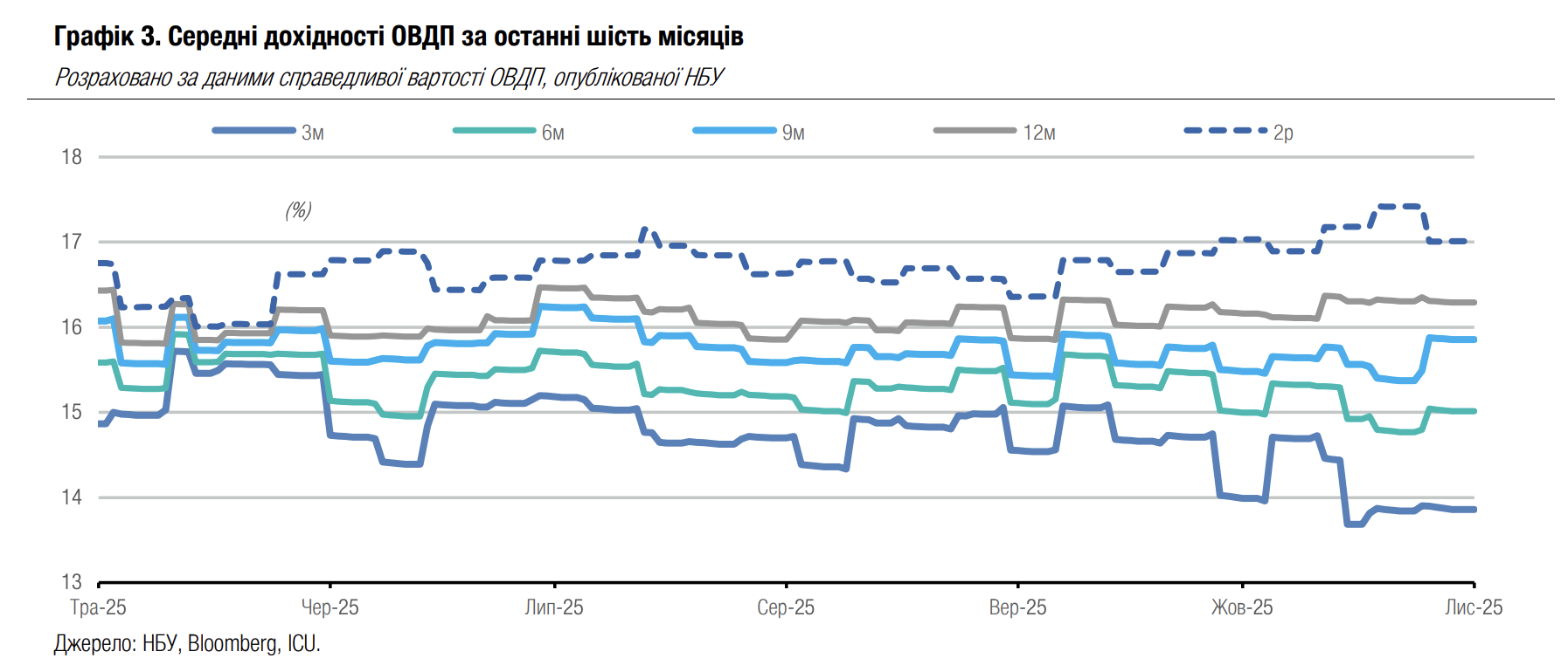 Фактично на ринку спостерігається дефіцит коротких інструментів, через що їхні дохідності за останні шість місяців знизилися: за тримісячними інструментами з-понад 15% до менш ніж 13%, а за піврічними паперами з майже 16% до 15%. Водночас дохідності довших інструментів знизилися за цей час несуттєво й за облігаціями з погашенням через 9-12 місяців залишаються близькими до 16%.