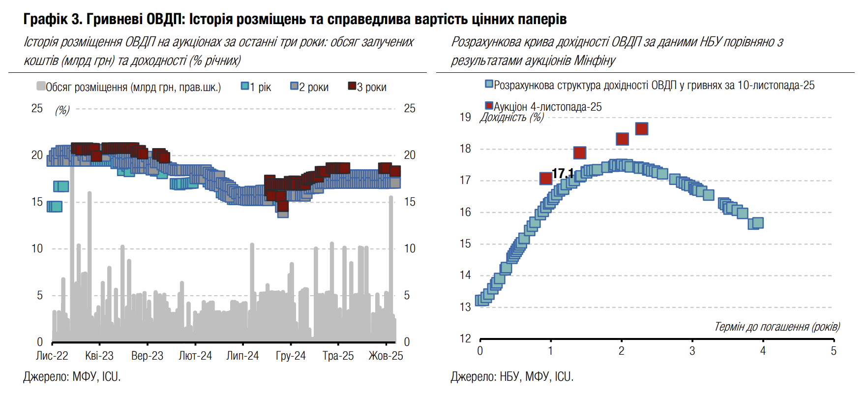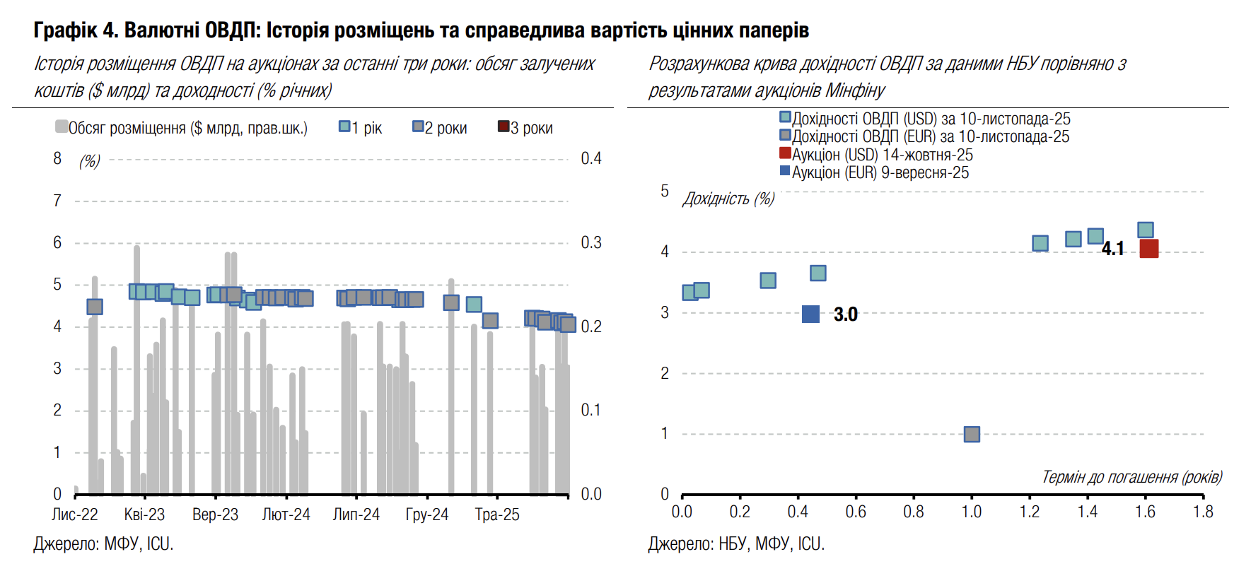 Щоб виконати передбачений бюджетним законом річний план з чистих запозичень, Мінфіну до кінця року необхідно розмістити ОВДП обсягом 280 млрд грн. Поточний темп запозичень свідчить, що Мінфін, імовірно, не має необхідності залучати весь цей обсяг. Минулого тижня Мінфін залучив до бюджету 4.6 млрд грн (див. огляд аукціону), розмістивши чотири гривневі інструменти з терміном обігу від року до трьох. На завтра анонсовано розміщення аналогічного набору облігацій. Усього ж до кінця року буде проведено ще сім аукціонів.