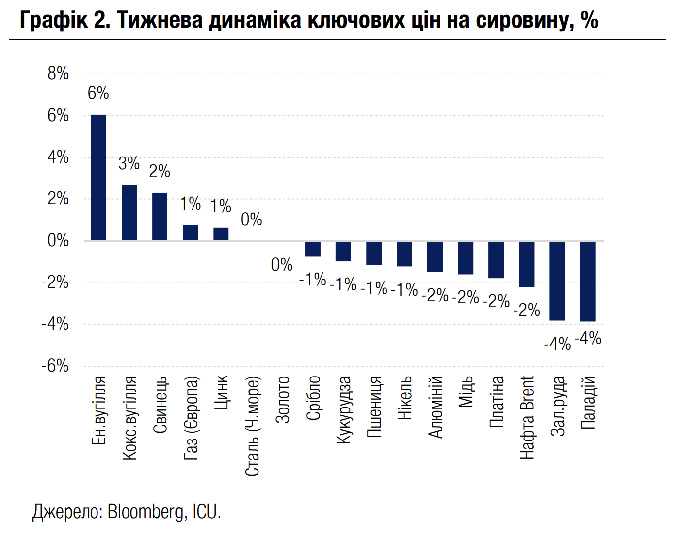 Тим часом на сировинних ринках продовжилося зниження цін на нафту (-2% за тиждень до $63.6 за барель марки Brent) на ознаках подальшого послаблення попиту в США і Європі. Серед аутсайдерів тижня опинилися ціни на залізну руду (-4%) через слабкий попит у Китаї, де триває скорочення виробництва сталі.