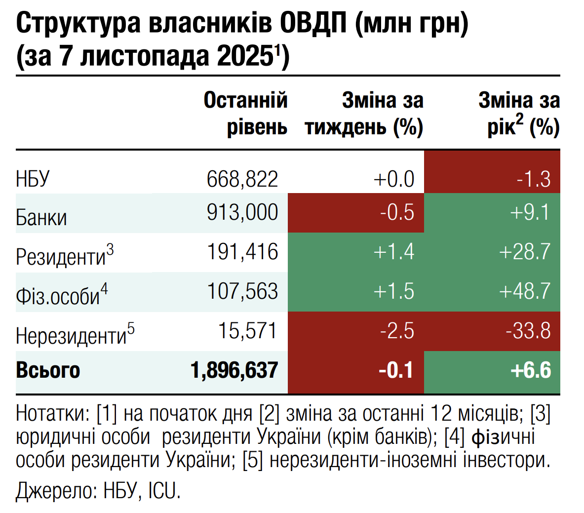 За перший тиждень листопада портфель фізичних осіб зріс на 1.5 млрд грн і майже досягнув 108 млрд грн, що є новим рекордом для портфелів роздрібних клієнтів. Ріст відбувався за рахунок придбання як гривневих, так і валютних облігацій, а також за рахунок переоцінки валютних ОВДП унаслідок незначного ослаблення курсу гривні (див. коментар нижче). Водночас частка гривневих облігацій у портфелях фізосіб залишається вище за 55%.