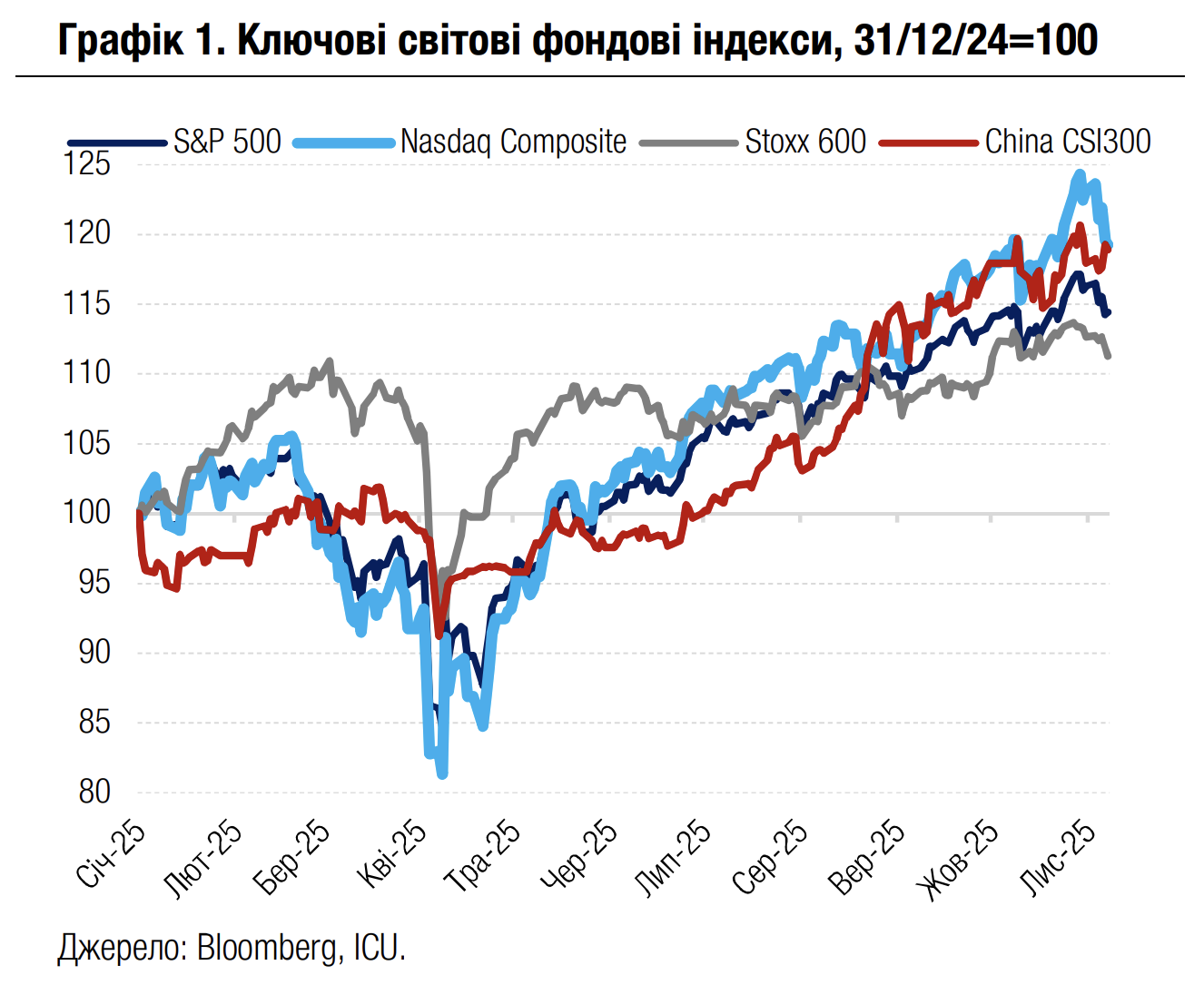 Завищені ринкові оцінки акцій сектору високих технологій були однією з центральних тем минулого тижня. Напруги ще більше додали заяви керівників провідних американських інвестиційних банків Morgan Stanley і Goldman Sachs, які попередили, що ринки вже, ймовірно, рухаються до значної корекції вниз. Інвесторів продовжують непокоїти багатомільярдні витрати IT-компаній на проєкти, пов’язані з ШІ: ще тиждень тому флагмани сектору Alphabet, Amazon, Meta і Alphabet відзвітували про капітальні вкладення за 3кв25 на загальну суму в $120 млрд.