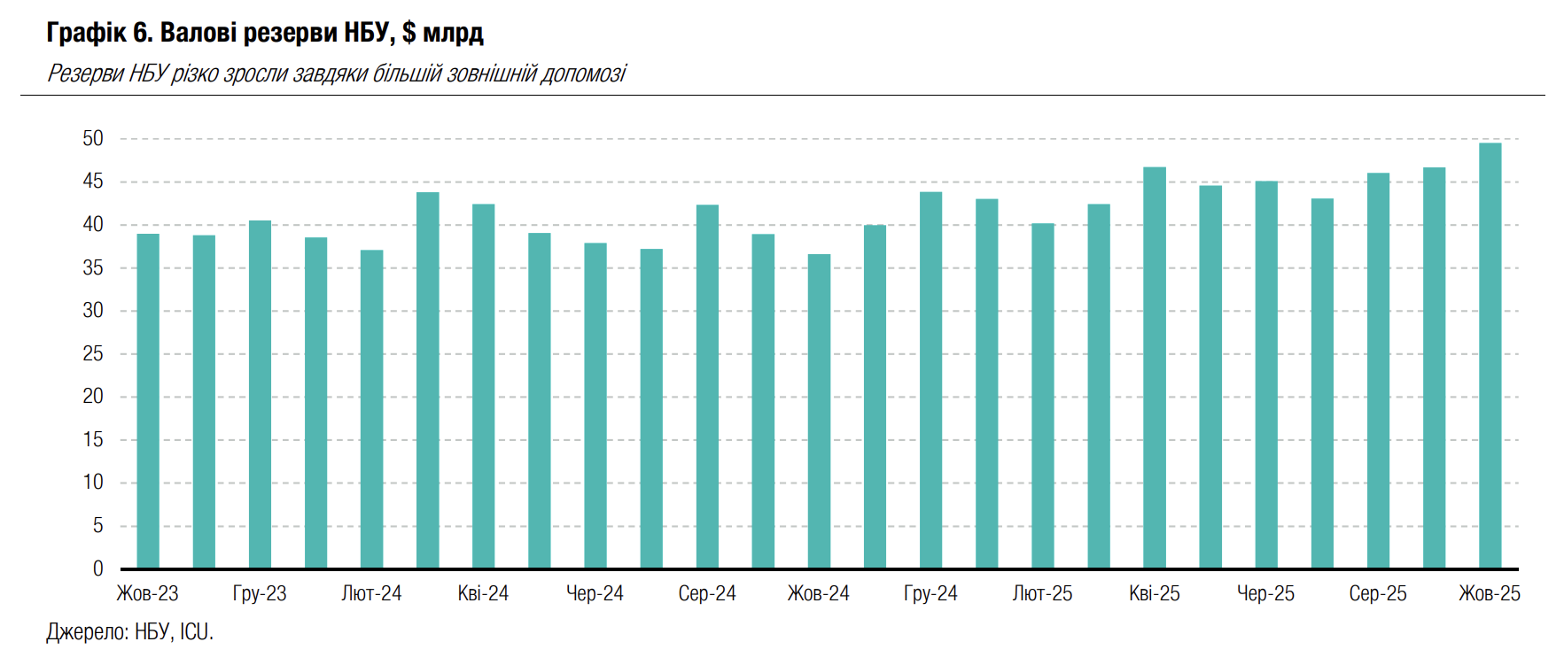 Погляд ICU: Зростання резервів НБУ ближче до кінця року було очікуваним, адже велика частина зовнішньої фінансової допомоги була запланована саме на 4кв25. Ми очікуємо, що резерви НБУ перевищать наприкінці поточного року $50 млрд і також будуть перевищувати цей рівень і наприкінці 2026 року, якщо зовнішні партнери погодять для України додаткове фондування, ймовірно, у форматі репараційного кредиту.