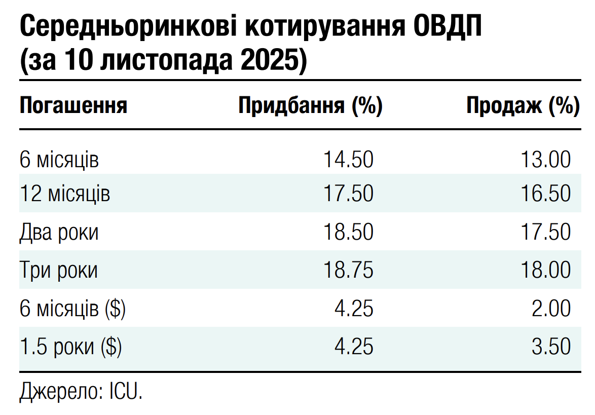 Посилення страхів на ринках акцій підтримувало вартість суверенних облігацій розвинених країн. Водночас боргові ринки чутливіше реагували на нечисленні свідчення стійкості західних економік, зокрема, на більше за прогнози зростання робочих місць у приватному секторі США у вересні. Це послабило впевненість інвесторів у тому, що ФРС продовжить цикл зниження ставок, і негативно вплинуло на вартість облігацій. Додаткове занепокоєння викликали перспективи можливого скасування нових імпортних мит Трампа Верховним судом США і, як результат, можливих значних втрат федерального бюджету. У тижневому підсумку дохідності десятирічних казначейських облігацій США зросли на незначні 2 б.п. до 4.1%.